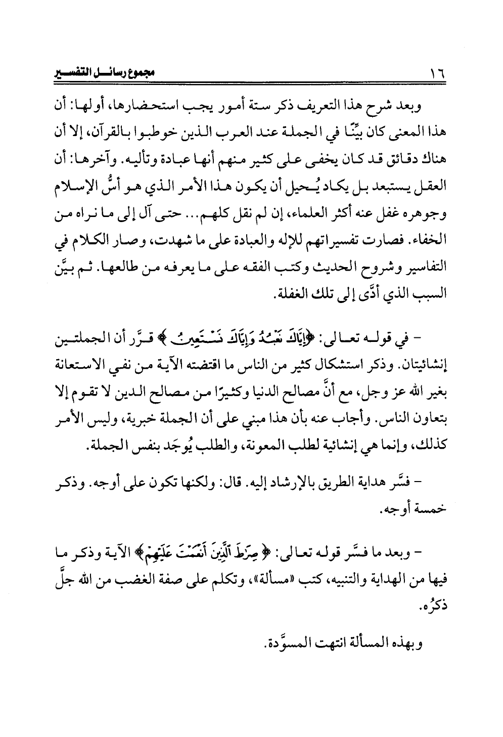 - وبعد ما فسَّر قوله تعالى: {صِرَاطَ الَّذِينَ أَنْعَمْتَ عَلَيْهِمْ} الآية وذكر ما فيها من الهداية والتنبيه، كتب "مسألة"، وتكلم على صفة الغضب من الله جلَّ ذكرُه.