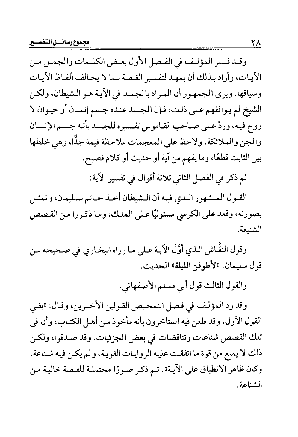 وقد فسر المؤلف في الفصل الأول بعض الكلمات والجمل من الآيات، وأراد بذلك أن يمهد لتفسير القصة بما لا يخالف ألفاظ الآيات وسياقها. ويرى الجمهور أن المراد بالجسد في الآية هو الشيطان، ولكن الشيخ لم يوافقهم على ذلك، فإن الجسد عنده جسم إنسان أو حيوان لا روح فيه، وردّ على صاحب القاموس تفسيره للجسد بأنه جسم الإنسان والجن والملائكة. ولاحظ على المعجمات ملاحظة قيمة جدًّا، وهي خلطها بين الثابت قطعًا، وما يفهم من آية أو حديث أو كلام فصيح.