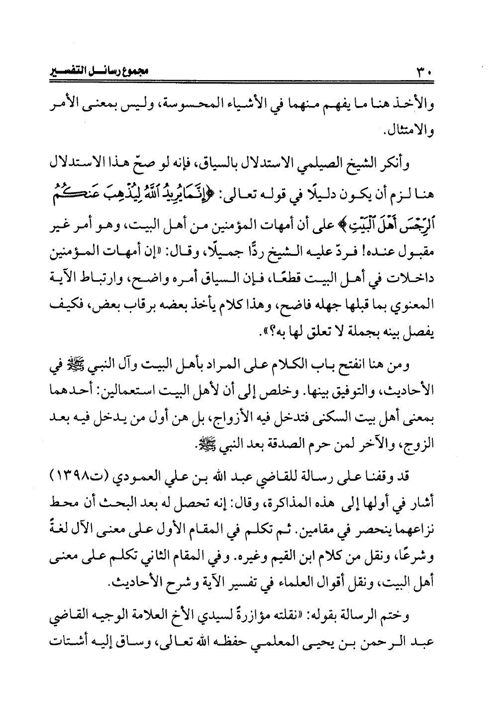 وأنكر الشيخ الصيلمي الاستدلال بالسياق، فإنه لو صحّ هذا الاستدلال هنا لزم أن يكون دليلًا في قوله تعالى: {إِنَّمَا يُرِيدُ اللَّهُ لِيُذْهِبَ عَنْكُمُ الرِّجْسَ أَهْلَ الْبَيْتِ} على أن أمهات المؤمنين من أهل البيت، وهو أمر غير مقبول عنده! فردّ عليه الشيخ ردًّا جميلًا، وقال: "إن أمهات المؤمنين داخلات في أهل البيت قطعًا، فإن السياق أمره واضح، وارتباط الآية المعنوي بما قبلها جهله فاضح، وهذا كلام يأخذ بعضه برقاب بعض، فكيف يفصل بينه بجملة لا تعلق لها به؟ ".