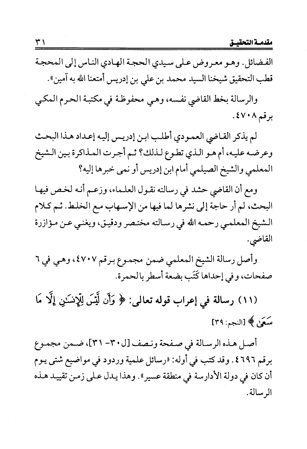 ومع أن القاضي حشد في رسالته نقول العلماء، وزعم أنه لخص فيها البحث، لم أر حاجة إلى نشرها لما فيها من الإسهاب مع الخلط. ثم كلام الشيخ المعلمي رحمه الله في رسالته مختصر ودقيق، ويغني عن مؤازرة القاضي.