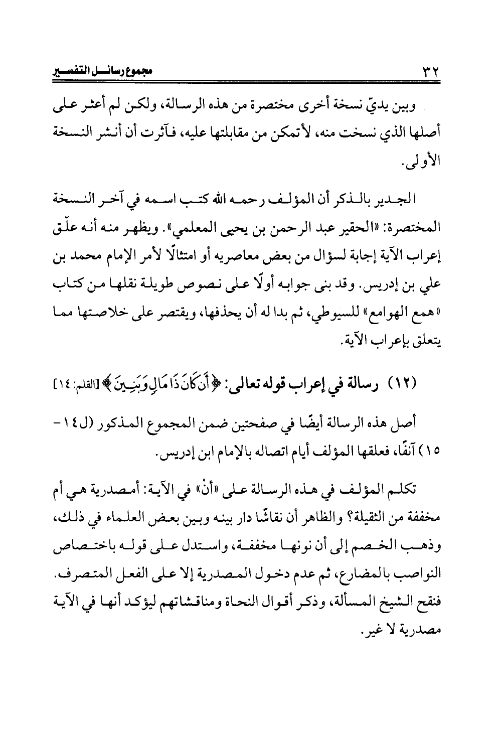 (١٢) رسالة في إعراب قوله تعالى: {أَنْ كَانَ ذَا مَالٍ وَبَنِينَ} [القلم: ١٤].