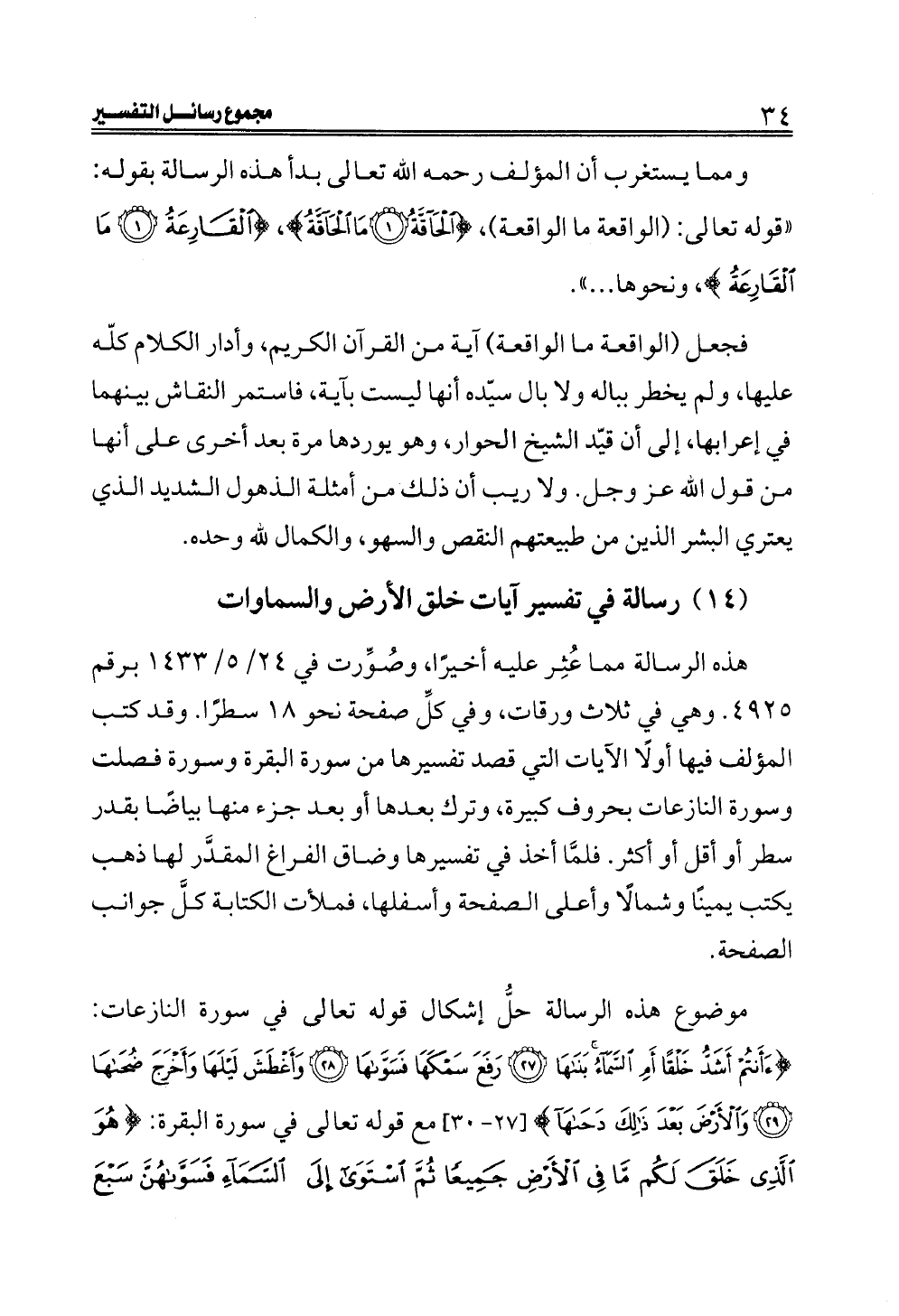 هذه الرسالة مما عُثِر عليه أخيرًا، وصُوِّرت في ٢٤/ ٥/١٤٣٣ برقم ٤٩٢٥. وهي في ثلاث ورقات، وفي كلِّ صفحة نحو ١٨ سطرًا. وقد كتب المؤلف فيها أولًا الآيات التي قصد تفسيرها من سورة البقرة وسورة فصلت وسورة النازعات بحروف كبيرة، وترك بعدها أو بعد جزء منها بياضًا بقدر سطر أو أقل أو أكثر. فلمَّا أخذ في تفسيرها وضاق الفراغ المقدَّر لها ذهب يكتب يمينًا وشمالًا وأعلى الصفحة وأسفلها، فملأت الكتابة كلَّ جوانب الصفحة.
