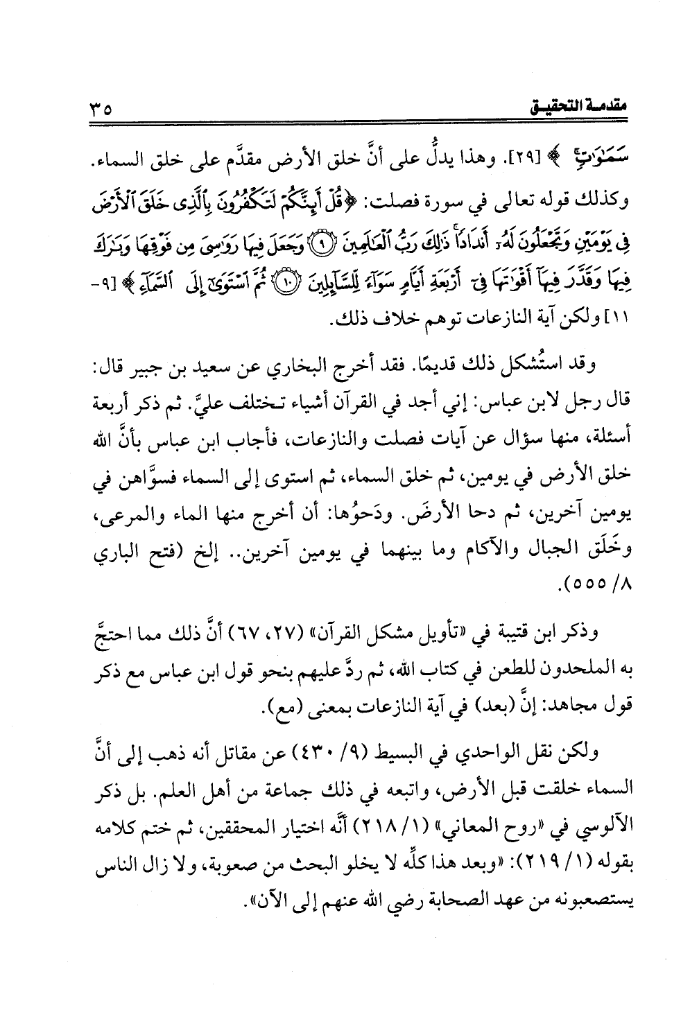 سَمَاوَاتٍ} [٢٩]. وهذا يدلُّ على أنَّ خلق الأرض مقدَّم على خلق السماء. وكذلك قوله تعالى في سورة فصلت: {قُلْ أَئِنَّكُمْ لَتَكْفُرُونَ بِالَّذِي خَلَقَ الْأَرْضَ فِي يَوْمَيْنِ وَتَجْعَلُونَ لَهُ أَنْدَادًا ذَلِكَ رَبُّ الْعَالَمِينَ (٩) وَجَعَلَ فِيهَا رَوَاسِيَ مِنْ فَوْقِهَا وَبَارَكَ فِيهَا وَقَدَّرَ فِيهَا أَقْوَاتَهَا فِي أَرْبَعَةِ أَيَّامٍ سَوَاءً لِلسَّائِلِينَ (١٠) ثُمَّ اسْتَوَى إِلَى السَّمَاءِ} [٩ - ١١] ولكن آية النازعات توهم خلاف ذلك.