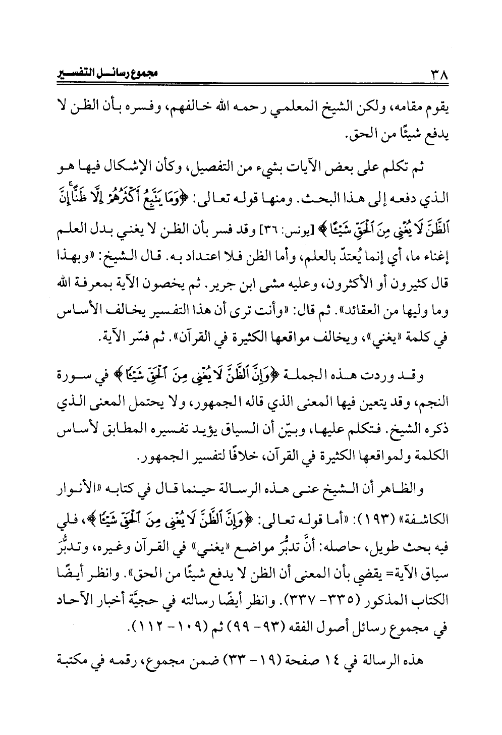 والظاهر أن الشيخ عنى هذه الرسالة حينما قال في كتابه "الأنوار الكاشفة" (١٩٣): "أما قوله تعالى: {وَإِنَّ الظَّنَّ لَا يُغْنِي مِنَ الْحَقِّ شَيْئًا}، فلي فيه بحث طويل، حاصله: أنَّ تدبُّرَ مواضع "يغني" في القرآن وغيره، وتدبُّرَ سياق الآية= يقضي بأن المعنى أن الظن لا يدفع شيئًا من الحق". وانظر أيضًا الكتاب المذكور (٣٣٥ - ٣٣٧). وانظر أيضًا رسالته في حجيَّة أخبار الآحاد في مجموع رسائل