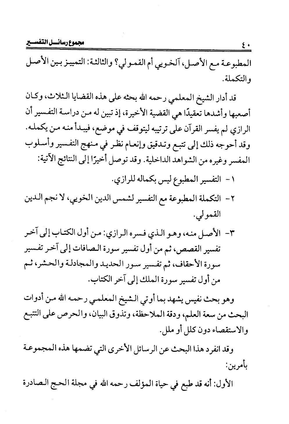 قد أدار الشيخ المعلمي رحمه الله بحثه على هذه القضايا الثلاث، وكان أصعبها وأشدها تعقيدًا هي القضية الأخيرة، إذ تبين له من دراسة التفسير أن الرازي لم يفسر القرآن على ترتيبه ليتوقف في موضع، فيبدأ منه من يكمله. وقد أحوجه ذلك إلى تتبع وتدقيق وإنعام نظر في منهج التفسير وأسلوب المفسر وغيره من الشواهد الداخلية. وقد توصل أخيرًا إلى النتائج الآتية: