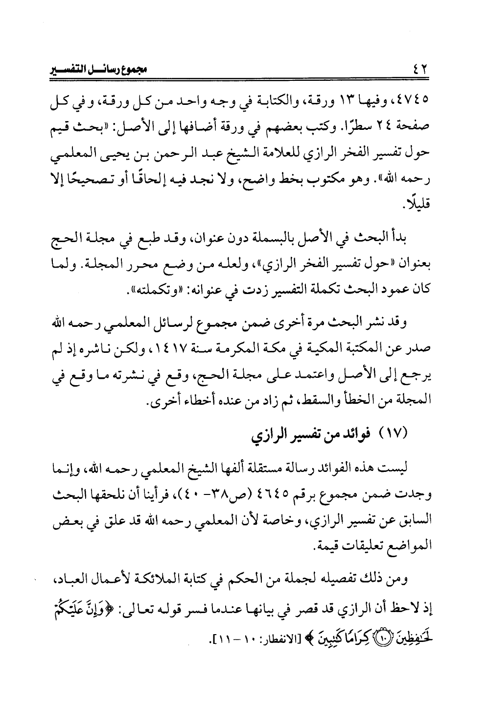 ليست هذه الفوائد رسالة مستقلة ألفها الشيخ المعلمي رحمه الله، وإنما وجدت ضمن مجموع برقم ٤٦٤٥ (ص ٣٨ - ٤٠)، فرأينا أن نلحقها البحث السابق عن تفسير الرازي، وخاصة لأن المعلمي رحمه الله قد علق في بعض المواضع تعليقات قيمة.