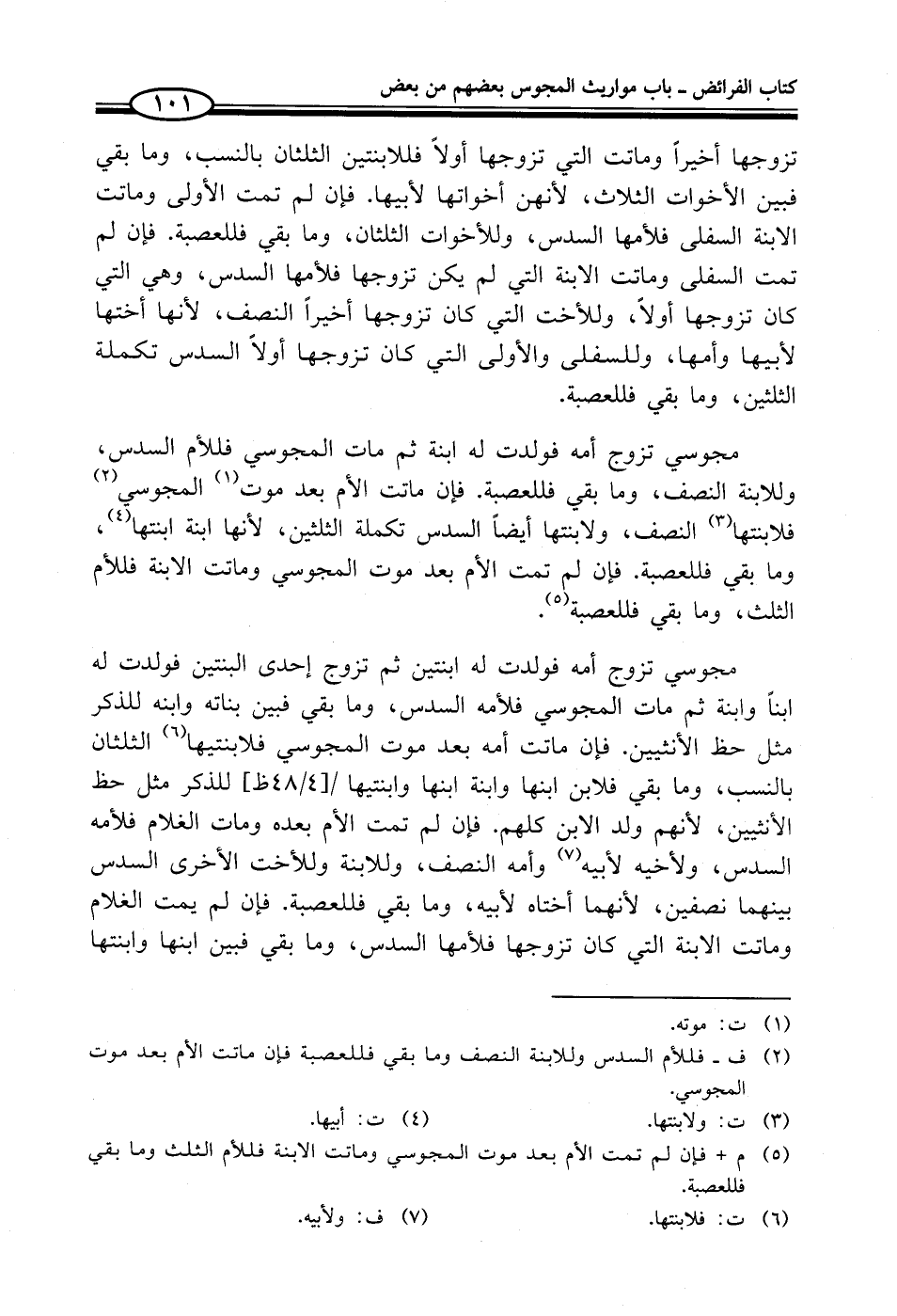 مجوسي تزوج أمه فولدت له ابنتين ثم تزوج إحدى البنتين فولدت له ابناً وابنة ثم مات المجوسي فلأمه السدس، وما بقي فبين بناته وابنه للذكر مثل حظ الأنثيين. فإن ماتت أمه بعد موت المجوسي فلابنتيها (¬6) الثلثان بالنسب، وما بقي فلابن ابنها وابنة ابنها وابنتيها للذكر مثل حظ الأنثيين، لأنهم ولد الابن كلهم. فإن لم تمت الأم بعده ومات الغلام فلأمه السدس، ولأخيه لأبيه (¬7) وأمه النصف، وللابنة وللأخت الأخرى السدس بينهما نصفين، لأنهما أختاه لأبيه، وما بقي فللعصبة. فإن لم يمت الغلام وماتت الابنة التي كان تزوجها فلأمها السدس، وما بقي فبين ابنها وابنتها