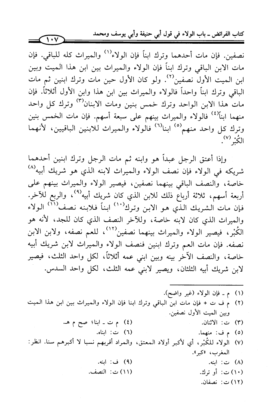 (¬2) م ف ت + فإن مات ابن الباقي وترك ابنا فإن الولاء والميراث بين ابن هذا الميت وبين الميت الأول نصفين.
