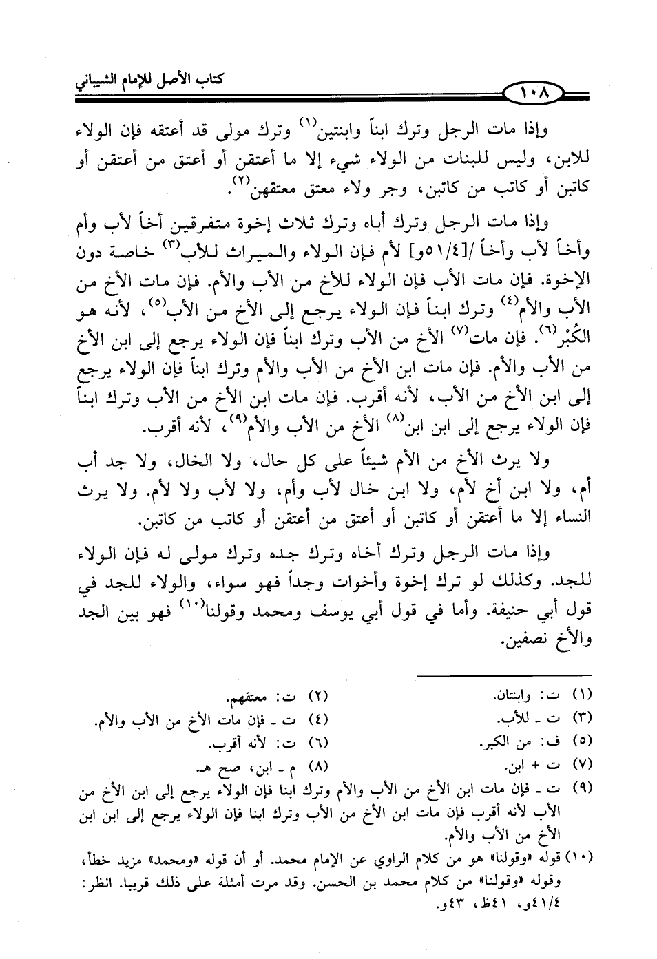 (¬9) ت - فإن مات ابن الأخ من الأب والأم وترك ابنا فكان الولاء يرجع إلى ابن الأخ من الأب لأنه أقرب فإن مات ابن الأخ من الأب وترك ابنا فكان الولاء يرجع إلى ابن ابن الأخ من الأب والأم.