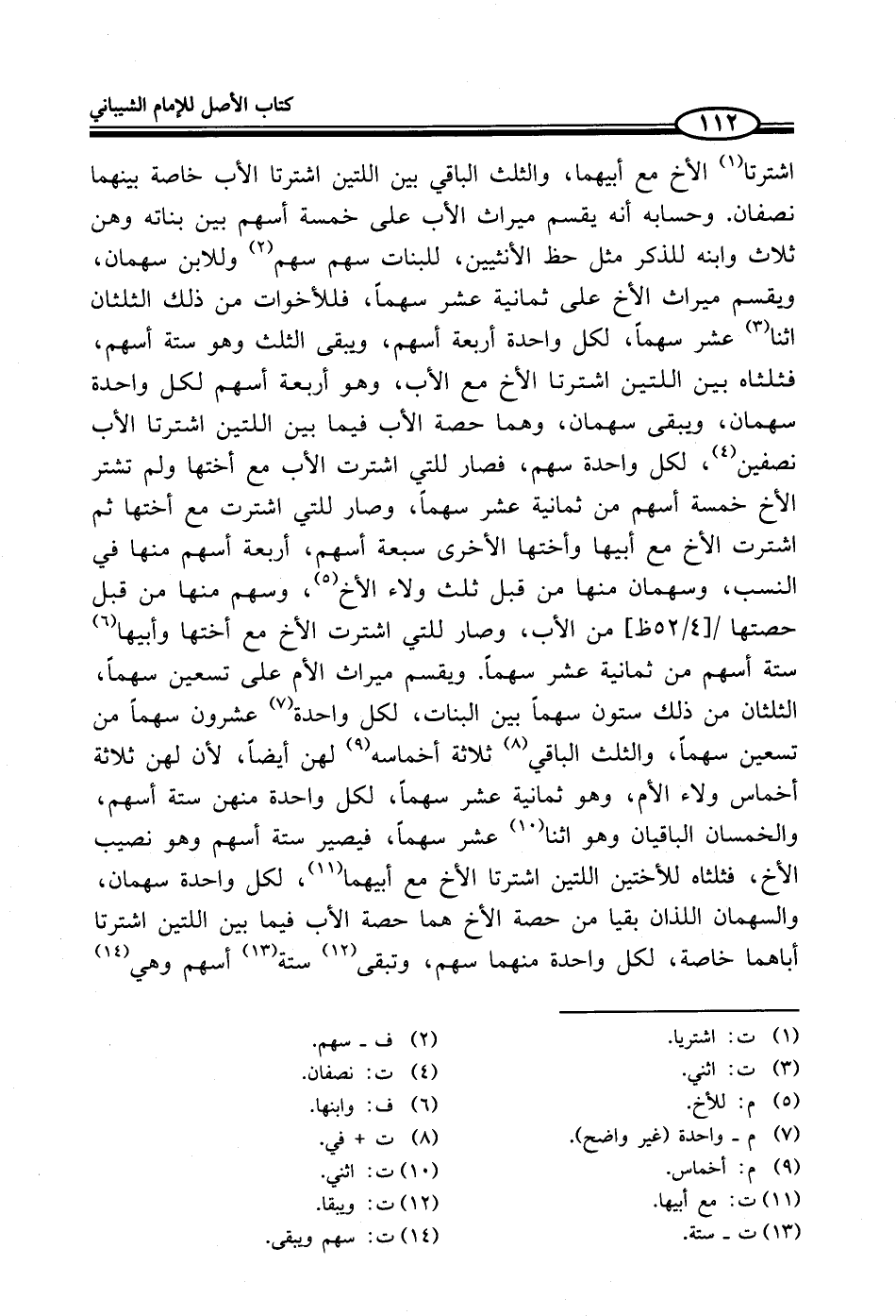 اشترتا (¬1) الأخ مع أبيهما، والثلث الباقي بين اللتين اشترتا الأب خاصة بينهما نصفان. وحسابه أنه يقسم ميراث الأب على خمسة أسهم بين بناته وهن ثلاث وابنه للذكر مثل حظ الأنثيين، للبنات سهم سهم (¬2) وللابن سهمان، ويقسم ميراث الأخ على ثمانية عشر سهماً، فللأخوات من ذلك الثلثان اثنا (¬3) عشر سهماً، لكل واحدة أربعة أسهم، ويبقى الثلث وهو ستة أسهم، فثلثاه بين اللتين اشترتا الأخ مع الأب، وهو أربعة أسهم لكل واحدة سهمان، ويبقى سهمان، وهما حصة الأب فيما بين اللتين اشترتا الأب نصفين (¬4)، لكل واحدة سهم، فصار للتي اشترت الأب مع أختها ولم تشتر الأخ خمسة أسهم من ثمانية عشر سهماً، وصار للتي اشترت مع أختها ثم اشترت الأخ مع أبيها وأختها الأخرى سبعة أسهم، أربعة أسهم منها في النسب، وسهمان منها من قبل ثلث ولاء الأخ (¬5)، وسهم منها من قبل حصتها من الأب، وصار للتي اشترت الأخ مع أختها وأبيها (¬6) ستة أسهم من ثمانية عشر سهماً. ويقسم ميراث الأم على تسعين سهماً، الثلثان من ذلك ستون سهماً بين البنات، لكل واحدة (¬7) عشرون سهماً من تسعين سهماً، والثلث الباقي (¬8) ثلاثة أخماسه (¬9) لهن أيضاً، لأن لهن ثلاثة أخماس ولاء الأم، وهو ثمانية عشر سهماً، لكل واحدة منهن ستة أسهم، والخمسان الباقيان وهو اثنا (¬10) عشر سهماً، فيصير ستة أسهم وهو نصيب الأخ، فثلثاه للأختين اللتين اشترتا الأخ مع أبيهما (¬11)، لكل واحدة سهمان، والسهمان اللذان بقيا من حصة الأخ هما حصة الأب فيما بين اللتين اشترتا أباهما خاصة، لكل واحدة منهما سهم، وتبقى (¬12) ستة (¬13) أسهم وهي (¬14)