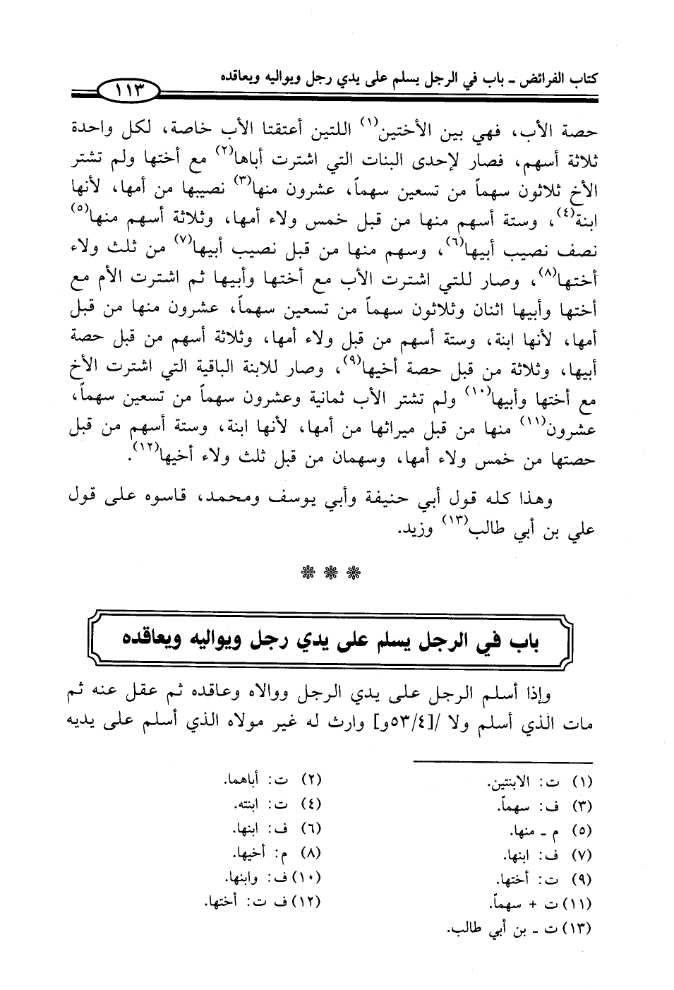 حصة الأب، فهي بين الأختين (¬1) اللتين أعتقتا الأب خاصة، لكل واحدة ثلاثة أسهم، فصار لإحدى البنات التي اشترت أباها (¬2) مع أختها ولم تشتر الأخ ثلاثون سهماً من تسعين سهماً، عشرون منها (¬3) نصيبها من أمها، لأنها ابنة (¬4)، وستة أسهم منها من قبل خمس ولاء أمها، وثلاثة أسهم منها (¬5) نصف نصيب أبيها (¬6)، وسهم منها من قبل نصيب أبيها (¬7) من ثلث ولاء أختها (¬8)، وصار للتي اشترت الأب مع أختها وأبيها ثم اشترت الأم مع أختها وأبيها اثنان وثلاثون سهماً من تسعين سهماً، عشرون منها من قبل أمها، لأنها ابنة، وستة أسهم من قبل ولاء أمها، وثلاثة أسهم من قبل حصة أبيها، وثلاثة من قبل حصة أخيها (¬9)، وصار للابنة الباقية التي اشترت الأخ مع أختها وأبيها (¬10) ولم تشتر الأب ثمانية وعشرون سهماً من تسعين سهماً، عشرون (¬11) منها من قبل ميراثها من أمها، لأنها ابنة، وستة أسهم من قبل حصتها من خمس ولاء أمها، وسهمان من قبل ثلث ولاء أخيها (¬12).