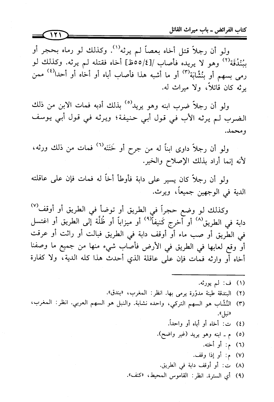 ولم أن رجلاً قتل أخاه بعصاً لم يرثه (¬1). وكذلك لو رماه بحجر أو ببُنْدُقَة (¬2) وهو لا يريده فأصاب أخاه فقتله لم يرثه. وكذلك لو رمى بسهم أو بنُشَّابَة (¬3) أو ما أشبه هذا فأصاب أباه أو أخاه أو أحدا (¬4) ممن يرثه كان قاتلاً، ولا ميراث له.