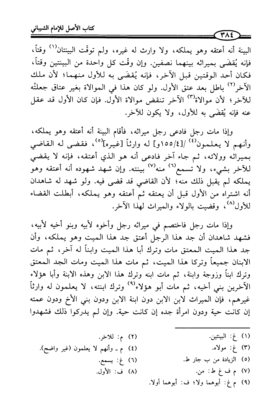 وإذا مات رجل فاختصم في ميراثه رجل وأخوه لأبيه وبنو أخيه لأبيه، فشهد شاهدان أن جد هذا الرجل أعتق جد هذا الميت وهو يملكه، وأن جد هذا الميت المعتق مات وترك أبا هذا الميت وابناً له آخر، ثم مات الابنان جميعاً وتركا هذا الميت، ثم مات هذا الميت ومات الجد المعتق وترك ابناً وزوجة وابنة، ثم مات ابنه وترك هذا الابن وهذه الابنة وأبا هؤلاء الآخرين بني أخيه، ثم مات أبو هؤلاء (¬9) وترك ابنته، لا يعلمون له وارثاً غيرهم، فإن الميراث لابن الابن دون ابنة الابن ودون بني الأخ ودون عمته إن كانت حية ودون امرأة جده إن كانت حية. وإن لم يدركوا ذلك فشهدوا