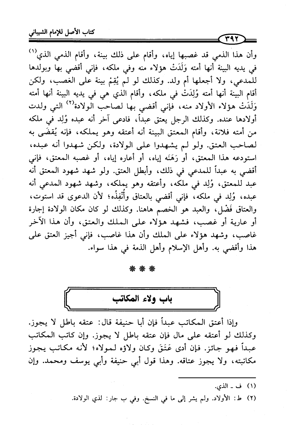 وأن هذا الذمي قد غصبها إياه، وأقام على ذلك بينة، وأقام الذمي الذي (¬1) في يديه البينة أنها أمته وَلَدَتْ هؤلاء منه وفي ملكه، فإني أقضي بها وبولدها للمدعي، ولا أجعلها أم ولد. وكذلك لو لم يُقِمْ بينة على الغصب، ولكن أقام البينة أنها أمته وُلِدَتْ في ملكه، وأقام الذي هي في يديه البينة أنها أمته وَلَدَتْ هؤلاء الأولاد منه، فإني أقضي بها لصاحب الولادة (¬2) التي ولدت أولادها عنده. وكذلك الرجل يعتق عبداً، فادعى آخر أنه عبده وُلِد في ملكه من أمته فلانة، وأقام المعتق البينة أنه أعتقه وهو يملكه، فإنه يُقضَى به لصاحب العتق. ولو لم يشهدوا على الولادة، ولكن شهدوا أنه عبده، استودعه هذا المعتق، أو رَهَنَه إياه، أو أعاره إياه، أو غصبه المعتق، فإني أقضي به عبداً للمدعي في ذلك، وأبطل العتق. ولو شهد شهود المعتق أنه عبد للمعتق، وُلِد في ملكه، وأعتقه وهو يملكه، وشهد شهود المدعي أنه عبده، وُلِد في ملكه، فإني أقضي بالعتاق وأُنْفِذُه؛ لأن الدعوى قد استوت، والعتاق فَضْل، والعبد هو الخصم هاهنا. وكذلك لو كان مكان الولادة إجارة أو عارية أو غصب، فشهد هؤلاء على الملك والعتق، وأن هذا الآخر غاصب، وشهد هؤلاء على الملك وأن هذا غاصب، فإني أجيز العتق على هذا وأقضي به. وأهل الإسلام وأهل الذمة في هذا سواء.