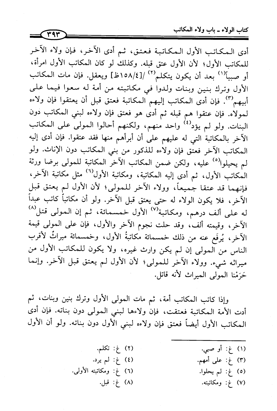 أدى المكاتب الأول المكاتبة فعتق، ثم أدى الآخر، فإن ولاء الآخر للمكاتب الأول؛ لأن الأول عتق قبله. وكذلك لو كان المكاتب الأول امرأة، أو صبياً (¬1) بعد أن يكون يتكلم (¬2) ويعقل. فإن مات المكاتب الأول وترك بنين وبنات ولدوا في مكاتبته من أمة له سعوا فيما على أبيهم (¬3). فإن أدى المكاتب إليهم المكاتبة فعتق قبل أن يعتقوا فإن ولاءه لمولاه. فإن عتقوا هم قبله ثم أدى هو فعتق فإن ولاءه لبني المكاتب دون البنات. ولو لم يؤد (¬4) واحد منهم، ولكنهم أحالوا المولى على المكاتب الآخر بالمكاتبة التي له عليهم على أن أبرأهم منها فقد عتقوا. فإن أدى إليه المكاتب الآخر فعتق فإن ولاءه للذكور من بني المكاتب دون الإناث. ولو لم يحيلوا (¬5) عليه، ولكن ضمن المكاتب الآخر المكاتبة للمولى برضا ورثة المكاتب الأول، ثم أدى إليه المكاتبة، ومكاتبة الأول (¬6) مثل مكاتبة الآخر، فإنهما قد عتقا جميعاً، وولاء الآخر للمولى؛ لأن الأول لم يعتق قبل الآخر، فلا يكون الولاء له حتى يعتق قبل الآخر. ولو أن مكاتباً كاتب عبداً له على ألف درهم، ومكاتبة (¬7) الأول خمسمائة، ثم إن المولى قتل (¬8) الآخر، وقيمته ألف، وقد حلت نجوم الآخر والأول، فإن على المولى قيمة الآخر، يُرفَع عنه من ذلك خمسمائة مكاتبةُ الأول، وخمسمائة ميراث لأقرب الناس من المولى إن لم يكن وارث غيره، ولا يكون للمكاتب الأول من ميراثه شيء. وولاء الآخر للمولى؛ لأن الأول لم يعتق قبل الآخر. وإنما حَرَمْنا المولى الميراث لأنه قاتل.