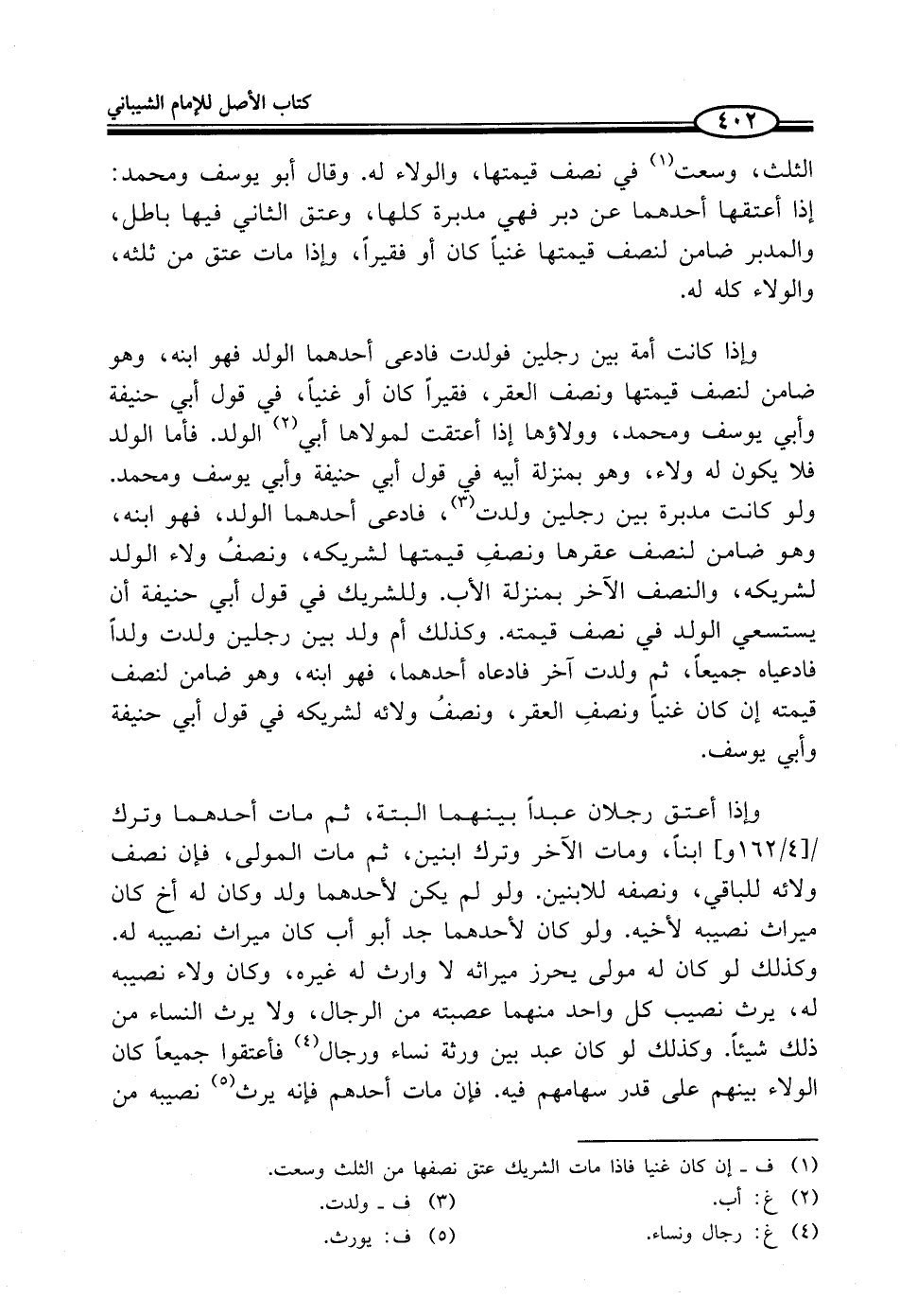 وإذا كانت أمة بين رجلين فولدت فادعى أحدهما الولد فهو ابنه، وهو ضامن لنصف قيمتها ونصف العقر، فقيراً كان أو غنياً، في قول أبي حنيفة وأبي يوسف ومحمد، وولاؤها إذا أعتقت لمولاها أبي (¬2) الولد. فأما الولد فلا يكون له ولاء، وهو بمنزلة أبيه في قول أبي حنيفة وأبي يوسف ومحمد. ولو كانت مدبرة بين رجلين ولدت (¬3)، فادعى أحدهما الولد، فهو ابنه، وهو ضامن لنصف عقرها ونصفِ قيمتها لشريكه، ونصفُ ولاء الولد لشريكه، والنصف الآخر بمنزلة الأب. وللشريك في قول أبى حنيفة أن يستسعي الولد في نصف قيمته. وكذلك أم ولد بين رجلين ولدت ولداً فادعياه جميعاً، ثم ولدت آخر فادعاه أحدهما، فهو ابنه، وهو ضامن لنصف قيمته إن كان غنياً ونصفِ العقر، ونصفُ ولائه لشريكه في قول أبي حنيفة وأبي يوسف.