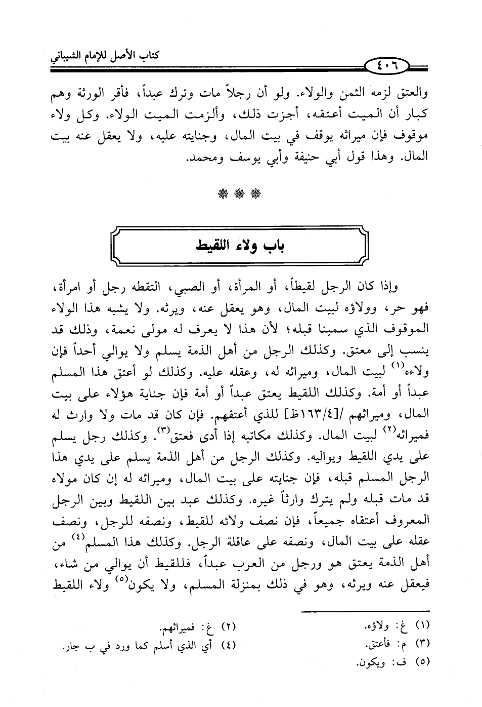 وإذا كان الرجل لقيطاً، أو المرأة، أو الصبي، التقطه رجل أو امرأة، فهو حر، وولاؤه لبيت المال، وهو يعقل عنه، ويرثه. ولا يشبه هذا الولاء الموقوف الذي سمينا قبله؛ لأن هذا لا يعرف له مولى نعمة، وذلك قد ينسب إلى معتق. وكذلك الرجل من أهل الذمة يسلم ولا يوالي أحداً فإن ولاءه (¬1) لبيت المال، وميراثه له، وعقله عليه. وكذلك لو أعتق هذا المسلم عبداً أو أمة. وكذلك اللقيط يعتق عبداً أو أمة فإن جناية هؤلاء على بيت المال، وميراثهم للذي أعتقهم. فإن كان قد مات ولا وارث له فميراثه (¬2) لبيت المال. وكذلك مكاتبه إذا أدى فعتق (¬3). وكذلك رجل يسلم على يدي اللقيط ويواليه. وكذلك الرجل من أهل الذمة يسلم على يدي هذا الرجل المسلم قبله، فإن جنايته على بيت المال، وميراثه له إن كان مولاه قد مات قبله ولم يترك وارثاً غيره. وكذلك عبد بين اللقيط وبين الرجل المعروف أعتقاه جميعاً، فإن نصف ولائه للقيط، ونصفه للرجل، ونصف عقله على بيت المال، ونصفه على عاقلة الرجل. وكذلك هذا المسلم (¬4) من أهل الذمة يعتق هو ورجل من العرب عبداً، فللقيط أن يوالي من شاء، فيعقل عنه ويرثه، وهو في ذلك بمنزلة المسلم، ولا يكون (¬5) ولاء اللقيط