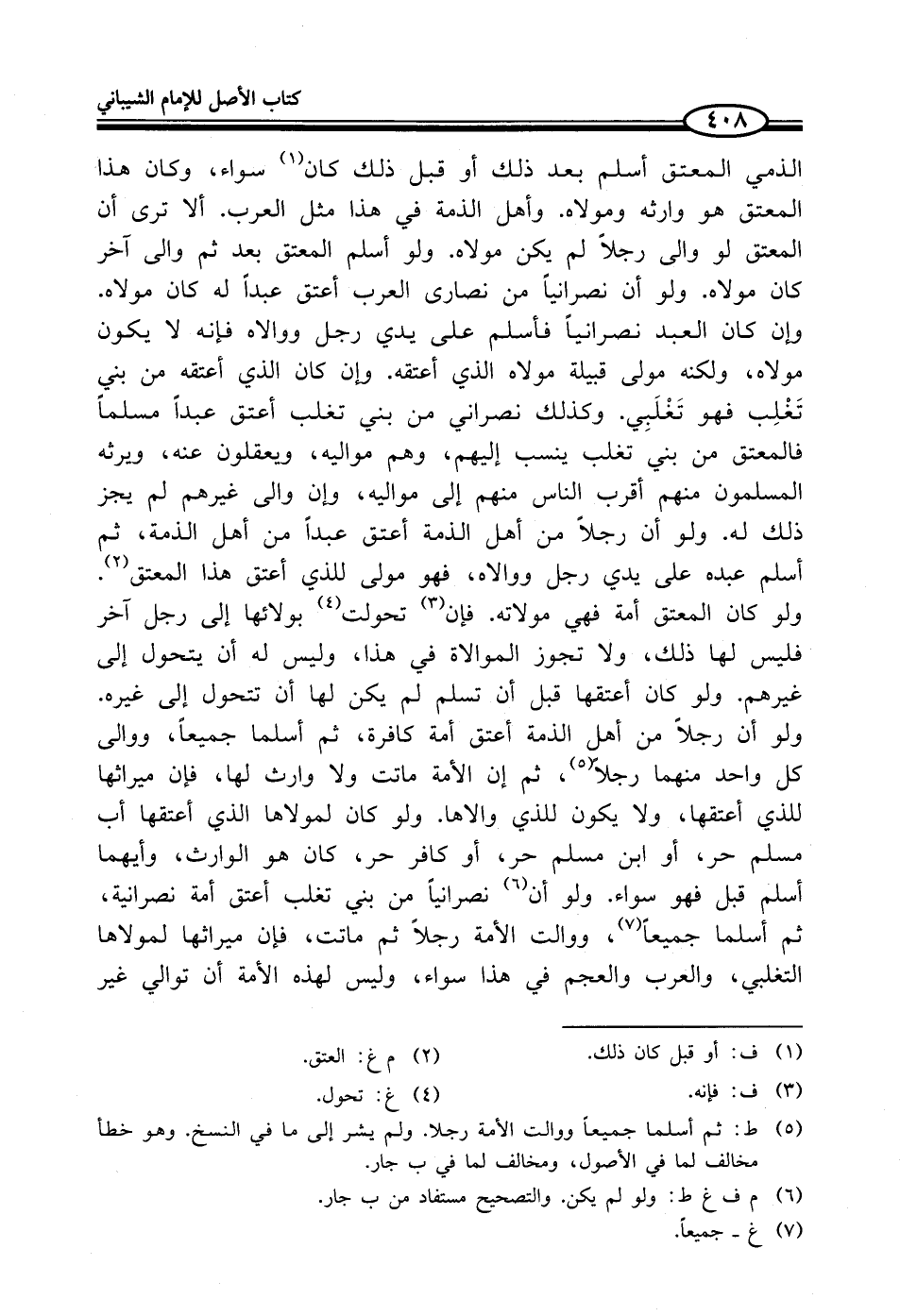 الذمي المعتق أسلم بعد ذلك أو قبل ذلك كان (¬1) سواء، وكان هذا المعتق هو وارثه ومولاه. وأهل الذمة في هذا مثل العرب. ألا ترى أن المعتق لو والى رجلاً لم يكن مولاه. ولو أسلم المعتق بعد ثم والى آخر كان مولاه. ولو أن نصرانياً من نصارى العرب أعتق عبداً له كان مولاه. وإن كان العبد نصرانياً فأسلم على يدي رجل ووالاه فإنه لا يكون مولاه، ولكنه مولى قبيلة مولاه الذي أعتقه. وإن كان الذي أعتقه من بني تَغْلِب فهو تَغْلَبِي. وكذلك نصراني من بني تغلب أعتق عبداً مسلماً فالمعتق من بني تغلب ينسب إليهم، وهم مواليه، ويعقلون عنه، ويرثه المسلمون منهم أقرب الناس منهم إلى مواليه، وإن والى غيرهم لم يجز ذلك له. ولو أن رجلاً من أهل الذمة أعتق عبداً من أهل الذمة، ثم أسلم عبده على يدي رجل ووالاه، فهو مولى للذي أعتق هذا المعتق (¬2). ولو كان المعتق أمة فهي مولاته. فإن (¬3) تحولت (¬4) بولائها إلى رجل آخر فليس لها ذلك، ولا تجوز الموالاة في هذا، وليس له أن يتحول إلى غيرهم. ولو كان أعتقها قبل أن تسلم لم يكن لها أن تتحول إلى غيره. ولو أن رجلاً من أهل الذمة أعتق أمة كافرة، ثم أسلما جميعاً، ووالى كل واحد منهما رجلاً (¬5)، ثم إن الأمة ماتت ولا وارث لها، فإن ميراثها للذي أعتقها، ولا يكون للذي والاها. ولو كان لمولاها الذي أعتقها أب مسلم حر، أو ابن مسلم حر، أو كافر حر، كان هو الوارث، وأيهما أسلم قبل فهو سواء. ولو أن (¬6) نصرانياً من بني تغلب أعتق أمة نصرانية، ثم أسلما جميعاً (¬7)، ووالت الأمة رجلاً ثم ماتت، فإن ميراثها لمولاها التغلبي، والعرب والعجم في هذا سواء، وليس لهذه الأمة أن توالي غير