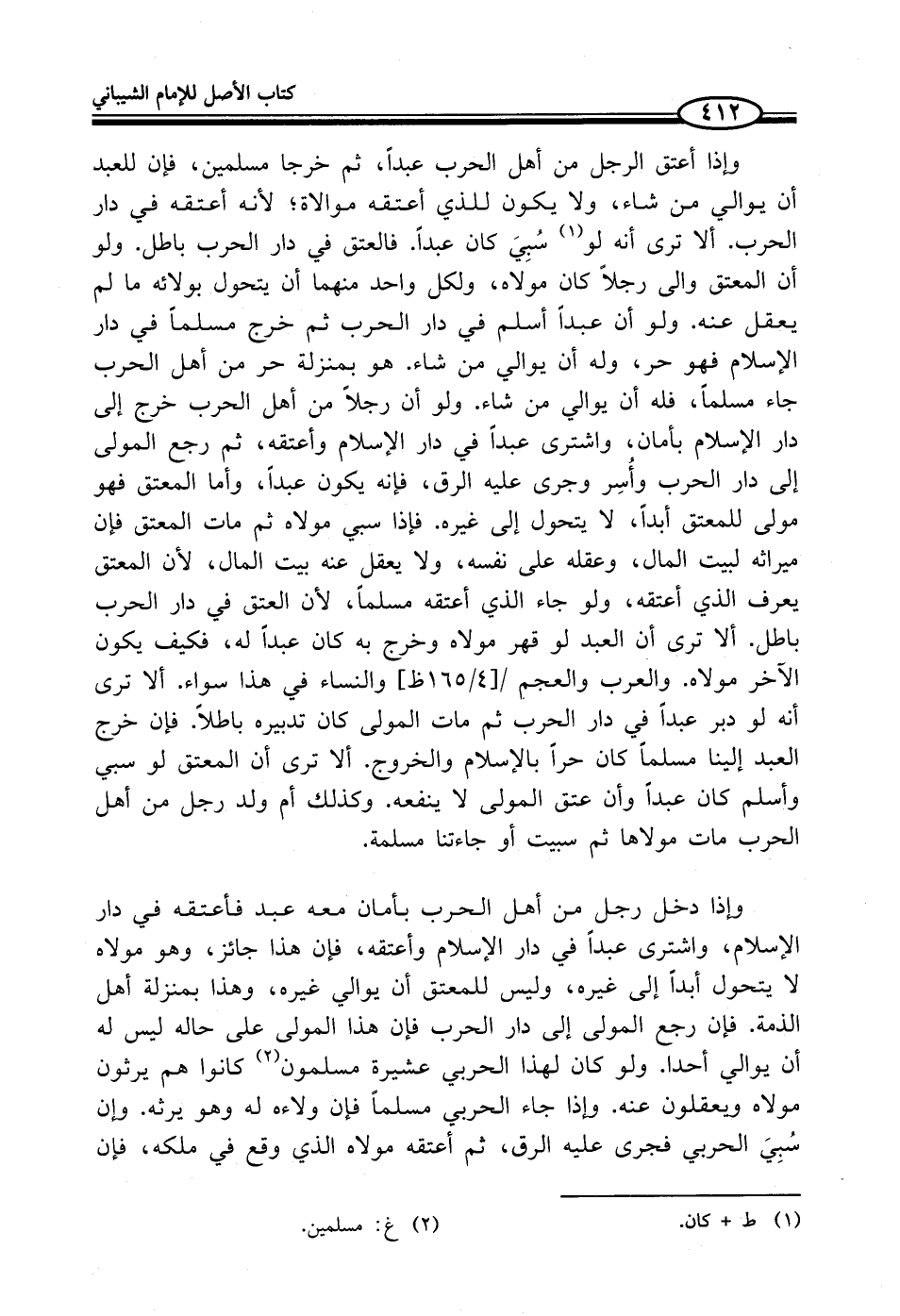 وإذا أعتق الرجل من أهل الحرب عبداً، ثم خرجا مسلمين، فإن للعبد أن يوالي من شاء، ولا يكون للذي أعتقه موالاة؛ لأنه أعتقه في دار الحرب. ألا ترى أنه لو (¬1) سُبِيَ كان عبداً. فالعتق في دار الحرب باطل. ولو أن المعتق والى رجلاً كان مولاه، ولكل واحد منهما أن يتحول بولائه ما لم يعقل عنه. ولو أن عبداً أسلم في دار الحرب ثم خرج مسلماً في دار الإسلام فهو حر، وله أن يوالي من شاء. هو بمنزلة حر من أهل الحرب جاء مسلماً، فله أن يوالي من شاء. ولو أن رجلاً من أهل الحرب خرج إلى دار الإسلام بأمان، واشترى عبداً في دار الإسلام وأعتقه، ثم رجع المولى إلى دار الحرب وأُسِر وجرى عليه الرق، فإنه يكون عبداً، وأما المعتق فهو مولى للمعتق أبداً، لا يتحول إلى غيره. فإذا سبي مولاه ثم مات المعتق فإن ميراثه لبيت المال، وعقله على نفسه، ولا يعقل عنه بيت المال، لأن المعتق يعرف الذي أعتقه، ولو جاء الذي أعتقه مسلماً، لأن العتق في دار الحرب باطل. ألا ترى أن العبد لو قهر مولاه وخرج به كان عبداً له، فكيف يكون الآخر مولاه. والعرب والعجم والنساء في هذا سواء. ألا ترى أنه لو دبر عبداً في دار الحرب ثم مات المولى كان تدبيره باطلاً. فإن خرج العبد إلينا مسلماً كان حراً بالإسلام والخروج. ألا ترى أن المعتق لو سبي وأسلم كان عبداً وأن عتق المولى لا ينفعه. وكذلك أم ولد رجل من أهل الحرب مات مولاها ثم سبيت أو جاءتنا مسلمة.
