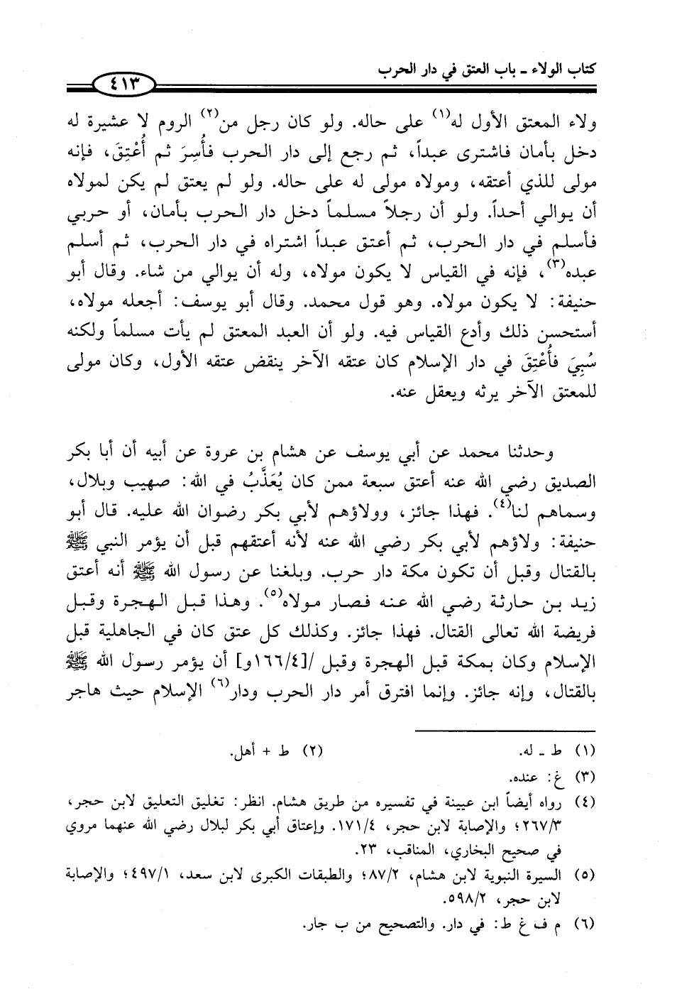 وحدثنا محمد عن أبي يوسف عن هشام بن عروة عن أبيه أن أبا بكر الصديق - رضي الله عنه - أعتق سبعة ممن كان يُعَذَّبُ في الله: صهيب وبلال، وسماهم لنا (¬4). فهذا جائز، وولاؤهم لأبي بكر رضوان الله عليه. قال أبو حنيفة: ولاؤهم لأبي بكر - رضي الله عنه - لأنه أعتقهم قبل أن يؤمر النبي - صلى الله عليه وسلم - بالقتال وقبل أن تكون مكة دار حرب. وبلغنا عن رسول الله - صلى الله عليه وسلم - أنه أعتق زيد بن حارثة - رضي الله عنه - فصار مولاه (¬5). وهذا قبل الهجرة وقبل فريضة الله تعالى القتال. فهذا جائز. وكذلك كل عتق كان في الجاهلية قبل الإسلام وكان بمكة قبل الهجرة وقبل أن يؤمر رسول الله - صلى الله عليه وسلم - بالقتال، وإنه جائز. وإنما افترق أمر دار الحرب ودار (¬6) الإسلام حيت هاجر