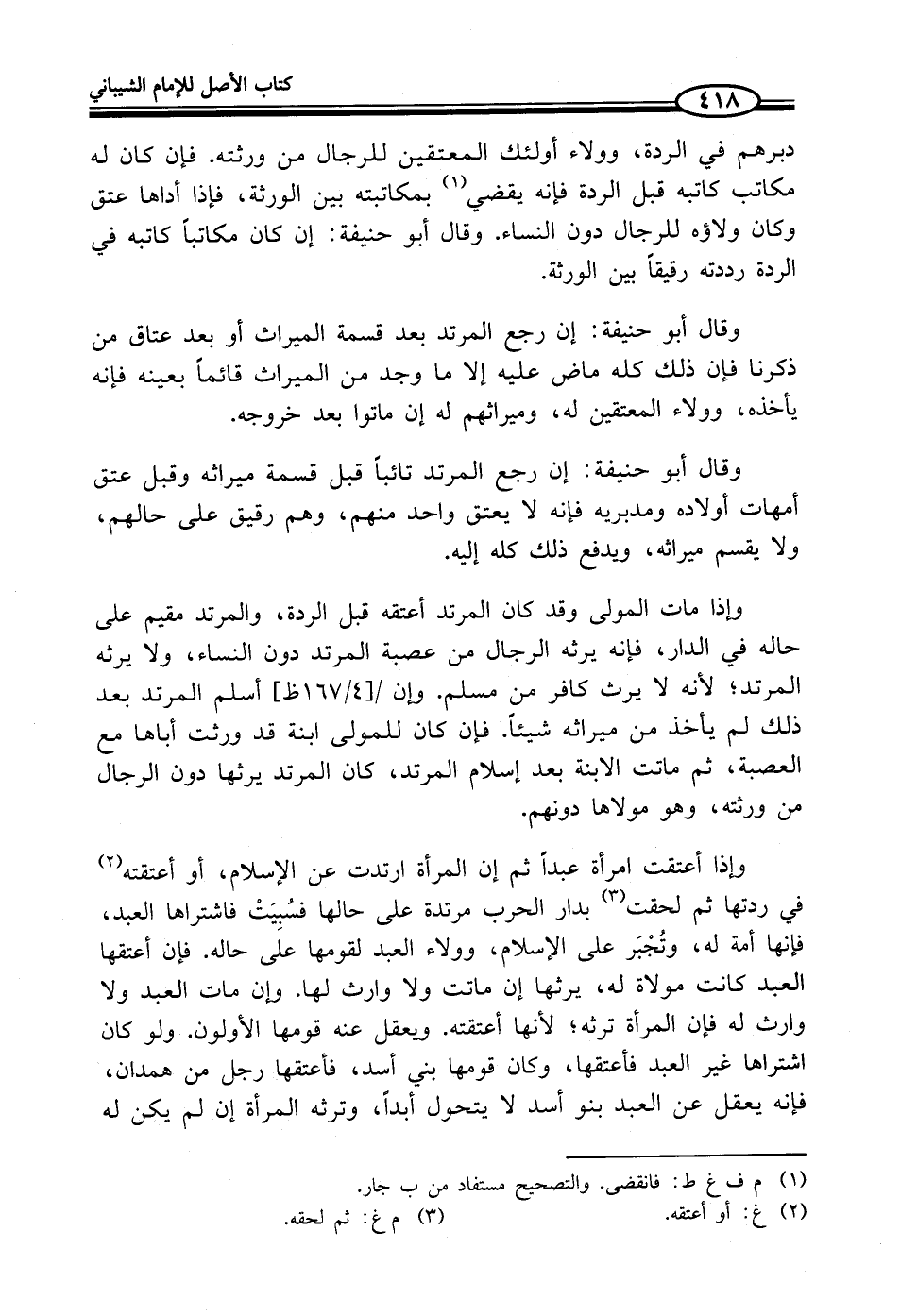 دبرهم في الردة، وولاء أولئك المعتقين للرجال من ورثته. فإن كان له مكاتب كاتبه قبل الردة فإنه يقضي (¬1) بمكاتبته بين الورثة، فإذا أداها عتق وكان ولاؤه للرجال دون النساء. وقال أبو حنيفة: إن كان مكاتباً كاتبه في الردة رددته رقيقاً بين الورثة.