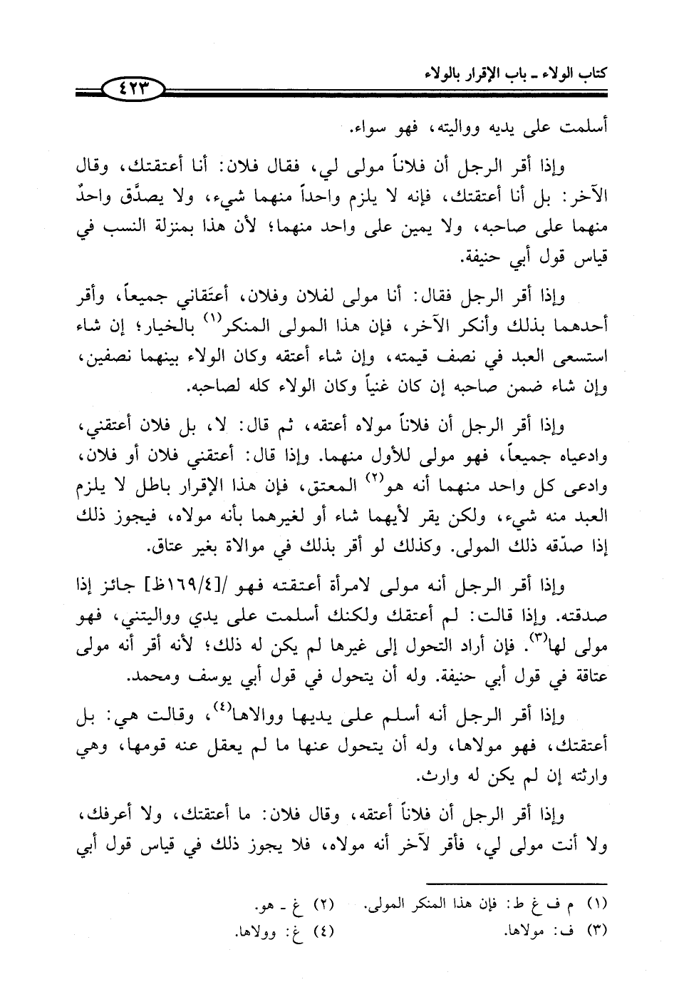 وإذا أقر الرجل أنه مولى لامرأة أعتقته فهو جائز إذا صدقته. وإذا قالت: لم أعتقك ولكنك أسلمت على يدي وواليتني، فهو مولى لها (¬3). فإن أراد التحول إلى غيرها لم يكن له ذلك، لأنه أقر أنه مولى عتاقة في قول أبي حنيفة. وله أن يتحول في قول أبي يوسف ومحمد.