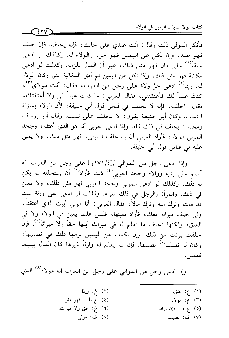 فأنكر المولى ذلك وقال: أنت عبدي على حالك، فإنه يحلف. فإن حلف فهو عبد، وإن نكل عن اليمين فهو حر، والولاء له. وكذلك لو ادعى عتقاً (¬1) على مال فهو مثل ذلك، غير أن المال يلزمه. وكذلك لو ادعى مكاتبة فهو مثل ذلك. وإذا نكل عن اليمين ثم أدى المكاتبة عتق وكان الولاء له. وإن (¬2) ادعى حرٌّ ولاء على رجل من العرب، فقال: أنت مولاي (¬3)، كنتُ عبداً لك فأعتقتني، فقال العربي: ما كنت عبداً لي ولا أعتقتك، فقال: احلف، فإنه لا يحلف في قياس قول أبي حنيفة؛ لأن الولاء بمنزلة النسب. وكان أبو حنيفة يقول: لا يحلف على نسب. وقال أبو يوسف ومحمد: يحلف في ذلك كله. وإذا ادعى العربي أنه هو الذي أعتقه، وجحد المولى الولاء، فأراد العربي أن يستحلف المولى، فهو مثل ذلك، ولا يمين عليه ني قياس قول أبي حنيفة.