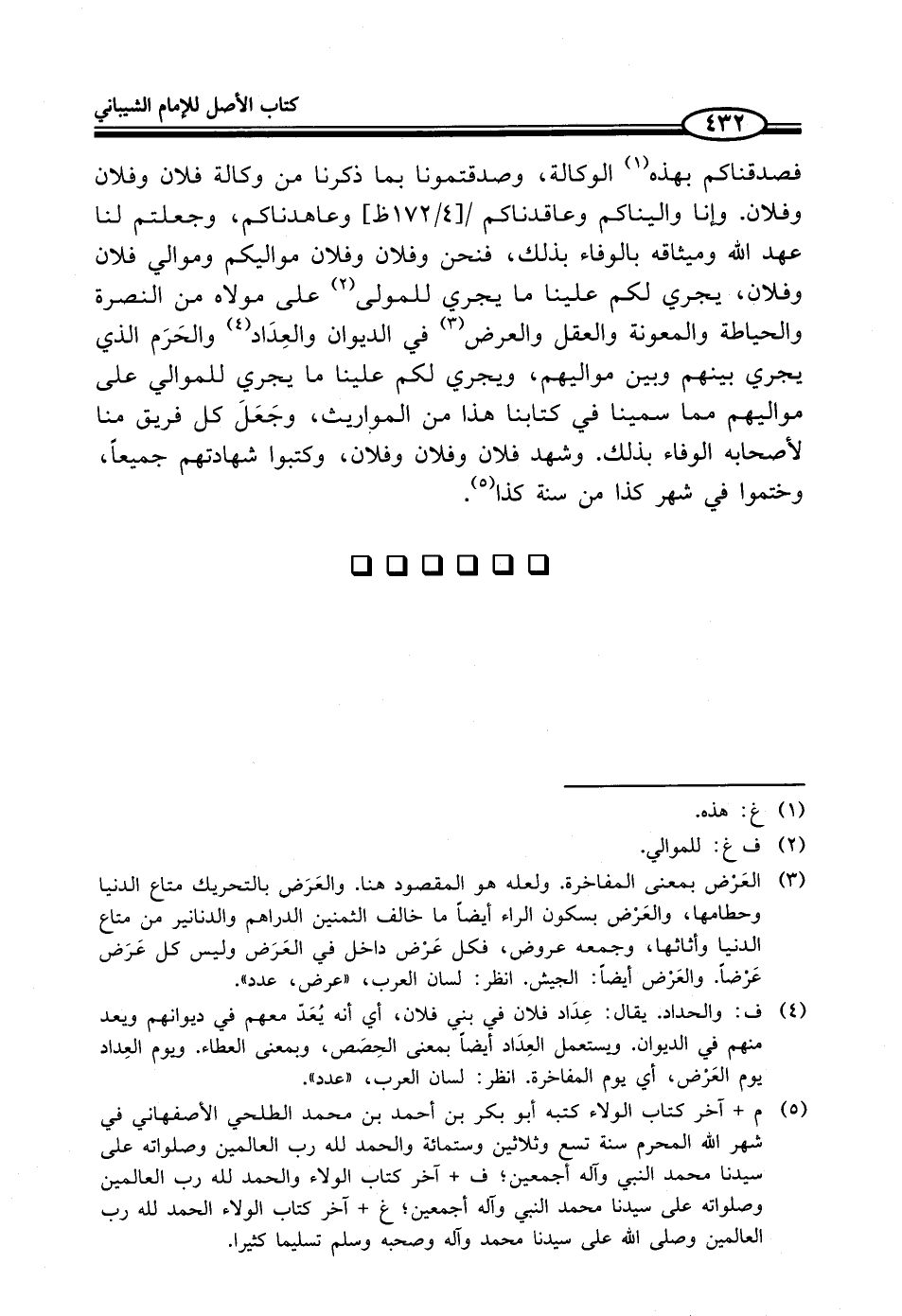 فصدقناكم بهذه (¬1) الوكالة، وصدقتمونا بما ذكرنا من وكالة فلان وفلان وفلان. وإنا واليناكم وعاقدناكم وعاهدناكم، وجعلتم لنا عهد الله وميثاقه بالوفاء بذلك، فنحن وفلان وفلان مواليكم وموالي فلان وفلان، يجري لكم علينا ما يجري للمولى (¬2) على مولاه من النصرة والحياطة والمعونة والعقل والعرض (¬3) في الديوان والعِدَاد (¬4) والحَرَم الذي يجري بينهم وبين مواليهم، ويجري لكم علينا ما يجري للموالي على مواليهم مما سمينا في كتابنا هذا من المواريث، وجَعَلَ كل فريق منا لأصحابه الوفاء بذلك. وشهد فلان وفلان وفلان، وكتبوا شهادتهم جميعاً، وختموا في شهر كذا من سنة كذا (¬5).