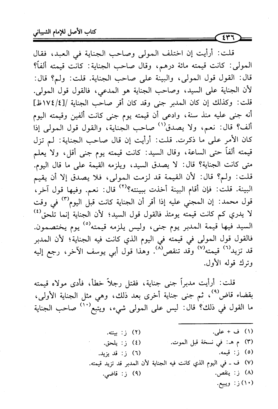 قلت: أرأيت إن اختلف المولى وصاحب الجناية في العبد، فقال المولى: كانت قيمته مائة درهم، وقال صاحب الجناية: كانت قيمته ألفاً؟ قال: القول قول المولى، والبينة على صاحب الجناية. قلت: ولم؟ قال: لأن الجناية على السيد، وصاحب الجناية هو المدعي، فالقول قول المولى. قلت: وكذلك إن كان المدبر جنى وقد كان أقر صاحب الجناية أنه جنى عليه منذ سنة، وادعى أن قيمته يوم جنى كانت ألفين وقيمته اليوم ألف؟ قال: نعم، ولا يصدق (¬1) صاحب الجناية، والقول قول المولى إذا كان الأمر على ما ذكرت. قلت: أرأيت إن قال صاحب الجناية: لم تزل قيمته ألفاً حتى الساعة، وقال السيد: كانت قيمته يوم جنى أقل، ولا يعلم متى كانت الجناية؟ قال: لا يصدق السيد، ويلزمه القيمة على ما قال اليوم. قلت: ولم؟ قال: لأن القيمة قد لزمت المولى، فلا يصدق إلا أن يقيم البينة. قلت: فإن أقام البينة أخذت ببينته؟ (¬2) قال: نعم. وفيها قول آخر، قول محمد: إن المجني عليه إذا أقر أن الجناية كانت قبل اليوم (¬3) في وقت لا يدري كم كانت قيمته يومئذ فالقول قول السيد؛ لأن الجناية إنما تلحق (¬4) السيد فيها قيمة المدبر يوم جنى، وليس يلزمه قيمته (¬5) يوم يختصمون. فالقول قول المولى في قيمته في اليوم الذي كانت فيه الجناية؛ لأن المدبر قد تزيد (¬6) قيمته (¬7) وقد تنقص (¬8). وهذا قول أبي يوسف الآخر، رجع إليه وترك قوله الأول.