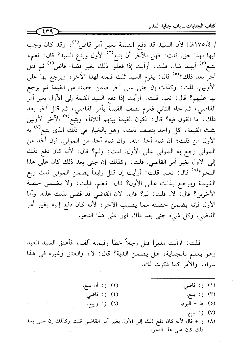 (¬8) ز + قال لأنه كان دفع ذلك إلى الأول بغير أمر القاضي قلت وكذلك إن جنى بعد ذلك كان على هذا النحو.