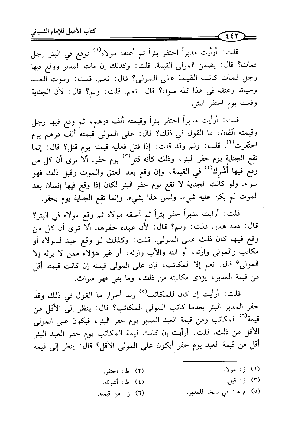 قلت: أرأيت إن كان للمكاتب (¬5) ولد أحرار ما القول في ذلك وقد حفر المدبر البئر بعدما كاتب المولى المكاتب؟ قال: ينظر إلى الأقل من قيمة (¬6) المكاتب ومن قيمة العبد المدبر يوم حفر البئر، فيكون على المولى الأقل من ذلك. قلت: أرأيت إن كانت قيمة المكاتب يوم حفر العبد البئر أقل من قيمة العبد يوم حفر أيكون على المولى الأقل؟ قال: ينظر إلى قيمة