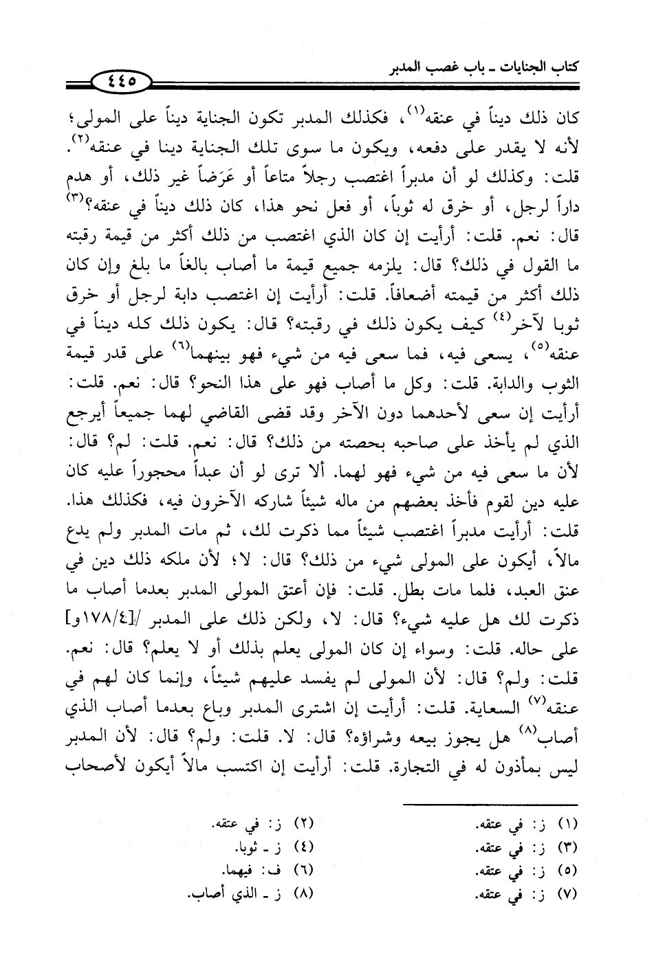 كان ذلك ديناً في عنقه (¬1)، فكذلك المدبر تكون الجناية ديناً على المولى؛ لأنه لا يقدر على دفعه، ويكون ما سوى تلك الجناية دينا في عنقه (¬2). قلت: وكذلك لو أن مدبراً اغتصب رجلاً متاعاً أو عَرَضاً غير ذلك، أو هدم داراً لرجل، أو خرق له ثوباً، أو فعل نحو هذا، كان ذلك ديناً في عنقه؟ (¬3) قال: نعم. قلت: أرأيت إن كان الذي اغتصب من ذلك أكثر من قيمة رقبته ما القول في ذلك؟ قال: يلزمه جميع قيمة ما أصاب بالغاً ما بلغ وإن كان ذلك أكثر من قيمته أضعافاً. قلت: أرأيت إن اغتصب دابة لرجل أو خرق ثوبا لآخر (¬4) كيف يكون ذلك في رقبته؟ قال. يكون ذلك كله ديناً في عنقه (¬5)، يسعى فيه، فما سعى فيه من شيء فهو بينهما (¬6) على قدر قيمة الثوب والدابة. قلت: وكل ما أصاب فهو على هذا النحو؟ قال: نعم. قلت: أرأيت إن سعى لأحدهما دون الآخر وقد قضى القاضي لهما جميعاً أيرجع الذي لم يأخذ على صاحبه بحصته من ذلك؟ قال: نعم. قلت: لم؟ قال: لأن ما سعى فيه من شيء فهو لهما. ألا ترى لو أن عبداً محجوراً عليه كان عليه دين لقوم فأخذ بعضهم من ماله شيئاً شاركه الآخرون فيه، فكذلك هذا. قلت: أرأيت مدبراً اغتصب شيئاً مما ذكرت لك، ثم مات المدبر ولم يدع مالاً، أيكون على المولى شيء من ذلك؟ قال: لا؛ لأن ملكه ذلك دين في عنق العبد، فلما مات بطل. قلت: فإن أعتق المولى المدبر بعدما أصاب ما ذكرت لك هل عليه شيء؟ قال: لا، ولكن ذلك على المدبر لم، على حاله. قلت: وسواء إن كان المولى يعلم بذلك أو لا يعلم؟ قال: نعم. قلت: ولم؟ قال: لأن المولى لم يفسد عليهم شيئاً، وإنما كان لهم في عنقه (¬7) السعاية. قلت: أرأيت إن اشترى المدبر وباع بعدما أصاب الذي أصاب (¬8) هل يجوز بيعه وشراؤه؟ قال: لا. قلت: ولم؟ قال: لأن المدبر ليس بمأذون له في التجارة. قلت: أرأيت إن اكتسب مالاً أيكون لأصحاب