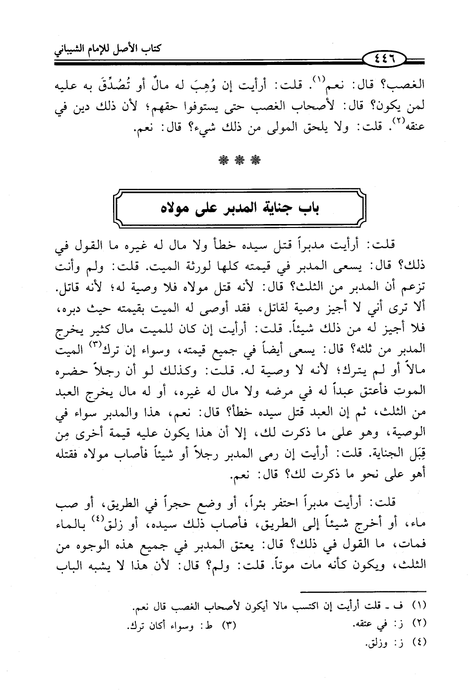قلت: أرأيت مدبراً احتفر بئراً، أو وضع حجراً في الطريق، أو صب ماء، أو أخرج شيئاً إلى الطريق، فأصاب ذلك سيده، أو زلق (¬4) بالماء فمات، ما القول في ذلك؟ قال: يعتق المدبر في جميع هذه الوجوه من الثلث، ويكون كأنه مات موتاً. قلت: ولم؟ قال: لأن هذا لا يشبه الباب
