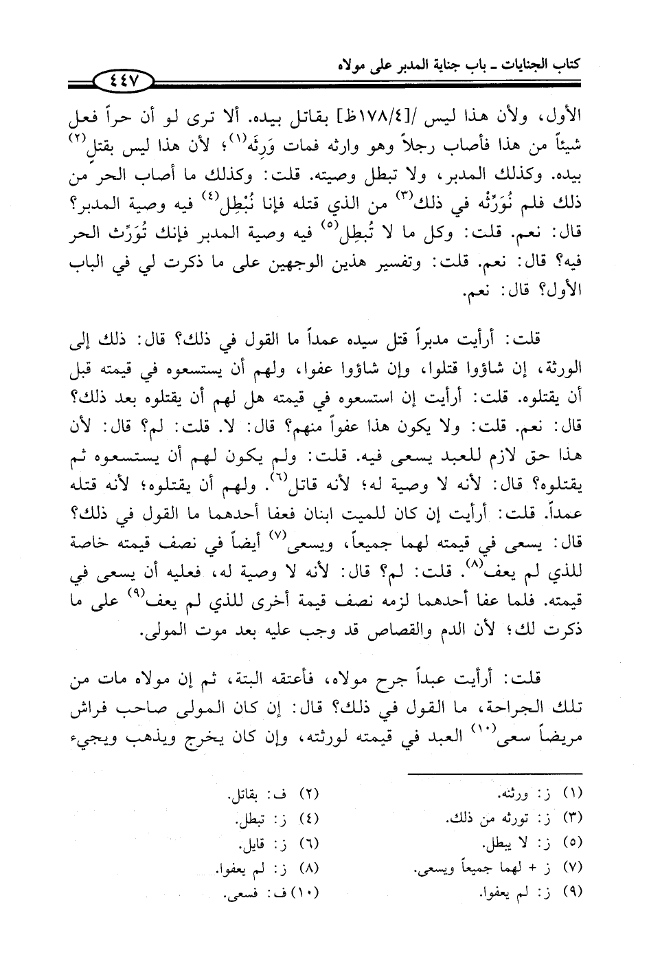 قلت: أرأيت مدبراً قتل سيده عمداً ما القول في ذلك؟ قال: ذلك إلى الورثة، إن شاؤوا قتلوا، وإن شاؤوا عفوا، ولهم أن يستسعوه في قيمته قبل أن يقتلوه. قلت: أرأيت إن استسعوه في قيمته هل لهم أن يقتلوه بعد ذلك؟ قال: نعم. قلت: ولا يكون هذا عفواً منهم؟ قال: لا. قلت: لم؟ قال: لأن هذا حق لازم للعبد يسعى فيه. قلت: ولم يكون لهم أن يستسعوه ثم يقتلوه؟ قال: لأنه لا وصية له؛ لأنه قاتل (¬6). ولهم أن يقتلوه؛ لأنه قتله عمداً. قلت: أرأيت إن كان للميت ابنان فعفا أحدهما ما القول في ذلك؟ قال: يسعى في قيمته لهما جميعاً، ويسعى (¬7) أيضاً في نصف قيمته خاصة للذي لم يعف (¬8). قلت: لم؟ قال: لأنه لا وصية له، فعليه أن يسعى في قيمته. فلما عفا أحدهما لزمه نصف قيمة أخرى للذي لم يعف (¬9) على ما ذكرت لك؛ لأن الدم والقصاص قد وجب عليه بعد موت المولى.