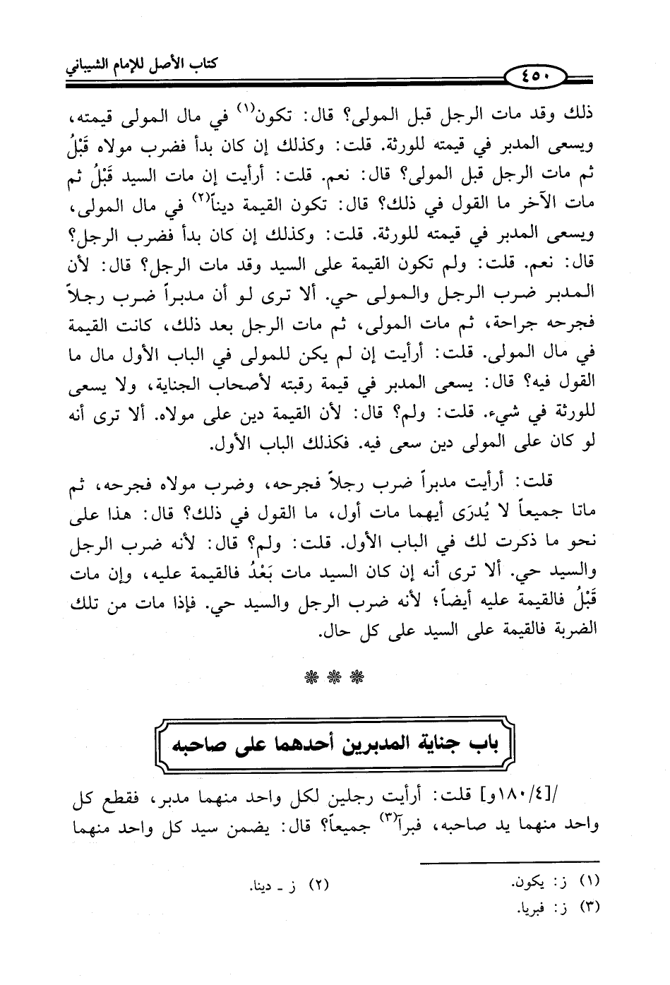 ذلك وقد مات الرجل قبل المولى؟ قال: تكون (¬1) في مال المولى قيمته، ويسعى المدبر في قيمته للورثة. قلت: وكذلك إن كان بدأ فضرب مولاه قَبْلُ ثم مات الرجل قبل المولى؟ قال: نعم. قلت: أرأيت إن مات السيد قَبْلُ ثم مات الآخر ما القول في ذلك؟ قال: تكون القيمة ديناً (¬2) في مال المولى، ويسعى المدبر في قيمته للورثة. قلت: وكذلك إن كان بدأ فضرب الرجل؟ قال: نعم. قلت: ولم تكون القيمة على السيد وقد مات الرجل؟ قال: لأن المدبر ضرب الرجل والمولى حي. ألا ترى لو أن مدبراً ضرب رجلاً فجرحه جراحة، ثم مات المولى، ثم مات الرجل بعد ذلك، كانت القيمة في مال المولى. قلت: أرأيت إن لم يكن للمولى في الباب الأول مال ما القول فيه؟ قال: يسعى المدبر في قيمة رقبته لأصحاب الجناية، ولا يسعى للورثة في شيء. قلت: ولم؟ قال: لأن القيمة دين على مولاه. ألا ترى أنه لو كان على المولى دين سعى فيه. فكذلك الباب الأول.