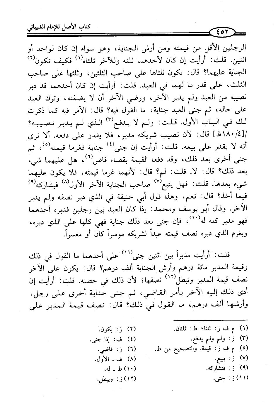 الرجلين الأقل من قيمته ومن أرش الجناية، وهو سواء إن كان لواحد أو اثنين. قلت: أرأيت إن كان لأحدهما ثلثه وللآخر ثلثاه (¬1) فكيف تكون (¬2) الجناية عليهما؟ قال: يكون ثلثاها على صاحب الثلثين، وثلثها على صاحب الثلث، على قدر ما لهما في العبد. قلت: أرأيت إن كان أحدهما قد دبر نصيبه من العبد ولم يدبر الآخر، ورضي الآخر أن لا يضمّنه، وترك العبد على حاله، ثم جنى العبد جناية، ما القول فيه؟ قال: الأمر فيه كما ذكرت لك في الباب الأول. قلت: ولم لا يدفع (¬3) الذي لم يدبر نصيبه؟ قال: لأن نصيب شريكه مدبر، فلا يقدر على دفعه. ألا ترى أنه لا يقدر على بيعه. قلت: أرأيت إن جنى (¬4) جناية فغرما قيمته (¬5)، ثم جنى أخرى بعد ذلك، وقد دفعا القيمة بقضاء قاض (¬6)، هل عليهما شيء بعد ذلك؟ قال: لا. قلت: لم؟ قال: لأنهما غرما قيمته، فلا يكون عليهما شيء بعدها. قلت: فهل يتبع (¬7) صاحب الجناية الآخر الأول (¬8) فيشاركه (¬9) فيما أخذ؟ قال: نعم، وهذا قول أبي حنيفة في الذي دبر نصفه ولم يدبر الآخر. وقال أبو يوسف ومحمد: إذا كان العبد بين رجلين فدبره أحدهما فهو مدبر كله له (¬10)، فإن جنى بعد ذلك جناية فهي كلها على الذي دبره، ويغرم الذي دبره نصف قيمته عبداً لشريكه موسراً كان أو معسراً.