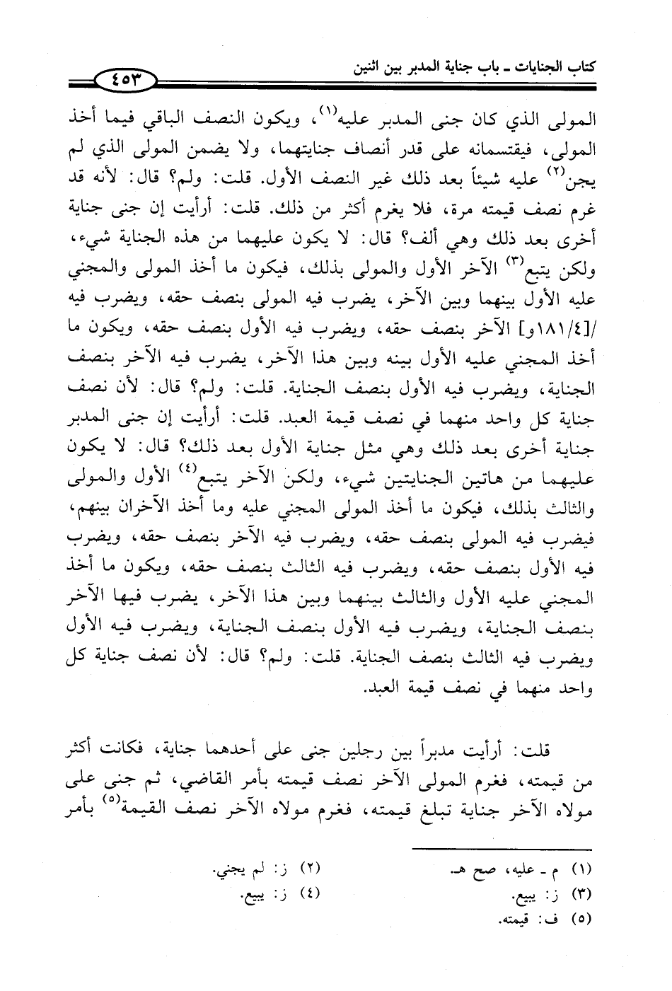 المولى الذي كان جنى المدبر عليه (¬1)، ويكون النصف الباقي فيما أخذ المولى، فيقتسمانه على قدر أنصاف جنايتهما، ولا يضمن المولى الذي لم يجن (¬2) عليه شيئاً بعد ذلك غير النصف الأول. قلت: ولم؟ قال: لأنه قد غرم نصف قيمته مرة، فلا يغرم أكثر من ذلك. قلت: أرأيت إن جنى جناية أخرى بعد ذلك وهي ألف؟ قال: لا يكون عليهما من هذه الجناية شيء، ولكن يتبع (¬3) الآخر الأول والمولى بذلك، فيكون ما أخذ المولى والمجني عليه الأول بينهما وبين الآخر، يضرب فيه المولى بنصف حقه، ويضرب فيه الآخر بنصف حقه، ويضرب فيه الأول بنصف حقه، ويكون ما أخذ المجني عليه الأول بينه وبين هذا الآخر، يضرب فيه الآخر بنصف الجناية، ويضرب فيه الأول بنصف الجناية. قلت: ولم؟ قال: لأن نصف جناية كل واحد منهما في نصف قيمة العبد. قلت: أرأيت إن جنى المدبر جناية أخرى بعد ذلك وهي مثل جناية الأول بعد ذلك؟ قال: لا يكون عليهما من هاتين الجنايتين شيء، ولكن الآخر يتبع (¬4) الأول والمولى والثالث بذلك، فيكون ما أخذ المولى المجني عليه وما أخذ الآخران بينهم، فيضرب فيه المولى بنصف حقه، ويضرب فيه الآخر بنصف حقه، ويضرب فيه الأول بنصف حقه، ويضرب فيه الثالث بنصف حقه، ويكون ما أخذ المجني عليه الأول والثالث بينهما وبين هذا الآخر، يضرب فيها الآخر بنصف الجناية، ويضرب فيه الأول بنصف الجناية، ويضرب فيه الأول ويضرب فيه الثالث بنصف الجناية. قلت: ولم؟ قال: لأن نصف جناية كل واحد منهما في نصف قيمة العبد.