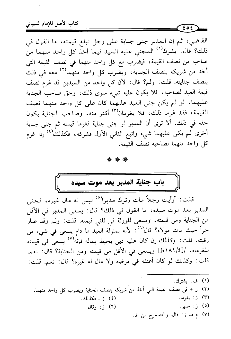 القاضي، ثم إن المدبر جنى جناية على رجل تبلغ قيمته، ما القول في ذلك؟ قال: يشرك (¬1) المجني عليه السيد فيما أخذ كل واحد منهما من صاحبه من نصف القيمة، فيضرب مع كل واحد منهما في نصف القيمة التي أخذ من شريكه بنصف الجناية، ويضرب كل واحد منهما (¬2) معه في ذلك بنصف جنايته. قلت: ولم؟ قال: لأن كل واحد من السيدين قد غرم نصف قيمة العبد لصاحبه، فلا يكون عليه شيء سوى ذلك، وحق صاحب الجناية عليهما، لو لم يكن جنى العبد عليهما كان على كل واحد منهما نصف القيمة، فقد غرما ذلك، فلا يغرمان (¬3) أكثر منه، وصاحب الجناية يكون حقه في ذلك. ألا ترى أن المدبر لو جنى جناية فغرما قيمته ثم جنى جناية أخرى لم يكن عليهما شيء واتبع الثاني الأول فشركه، فكذلك (¬4) إذا غرم كل واحد منهما لصاحبه نصف القيمة.
