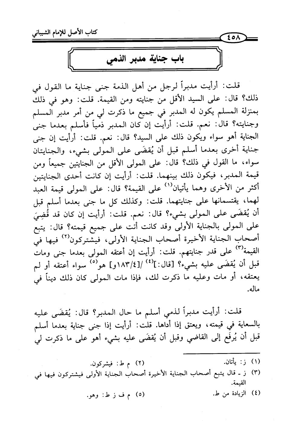 قلت: أرأيت مدبراً لرجل من أهل الذمة جنى جناية ما القول في ذلك؟ قال: على السيد الأقل من جنايته ومن القيمة. قلت: وهو في ذلك بمنزلة المسلم يكون له المدبر في جميع ما ذكرت لي من أمر مدبر المسلم وجنايته؟ قال: نعم. قلت: أرأيت إن كان المدبر ذمياً فأسلم بعدما جنى الجناية أهو سواء ويكون ذلك على السيد؟ قال: نعم. قلت: أرأيت إن جنى جناية أخرى بعدما أسلم قبل أن يُقضَى على المولى بشيء، والجنايتان سواء، ما القول في ذلك؟ قال: على المولى الأقل من الجنايتين جميعاً ومن قيمة المدبر، فيكون ذلك بينهما. قلت: أرأيت إن كانت أحدى الجنايتين أكثر من الأخرى وهما يأتيان (¬1) على القيمة؟ قال: على المولى قيمة العبد لهما، يقتسمانها على جنايتهما. قلت: وكذلك كل ما جنى بعدما أسلم قبل أن يُقضَى على المولى بشيء؟ قال: نعم. قلت: أرأيت إن كان قد قُضِيَ على المولى بالجناية الأولى وقد كانت أتت على جميع قيمته؟ قال: يتبع أصحاب الجناية الأخيرة أصحاب الجناية الأولى، فيشتركون (¬2) فيها في القيمة (¬3) على قدر جنايتهم. قلت: أرأيت إن أعتقه المولى بعدما جنى ومات قبل أن يُقضَى عليه بشيء؟ [قال:] (¬4) هو (¬5) سواء أعتقه أو لم يعتقه، أو مات وعليه ما ذكرت لك، فإذا مات المولى كان ذلك ديناً في ماله.
