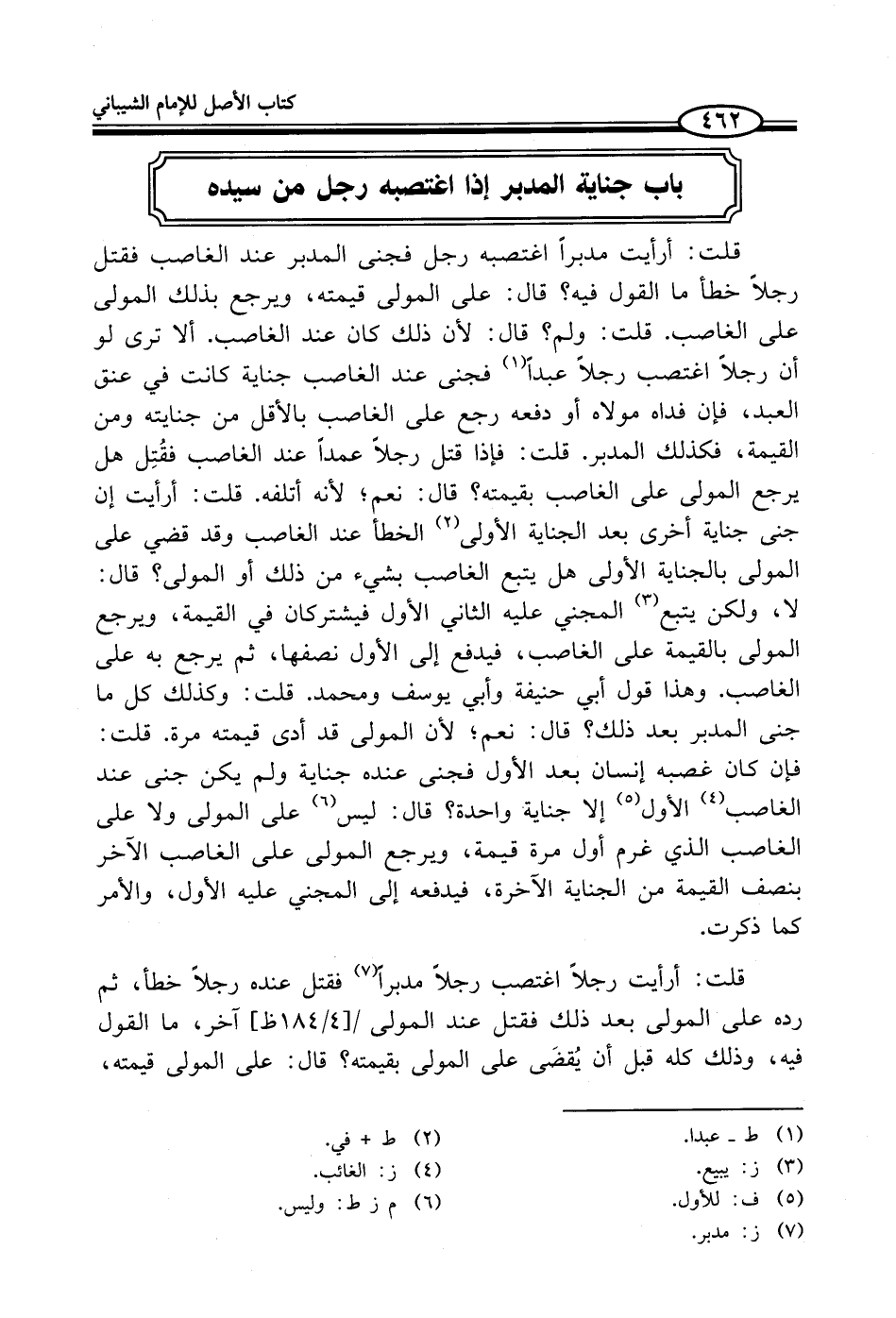 قلت: أرأيت مدبراً اغتصبه رجل فجنى المدبر عند الغاصب فقتل رجلاً خطأ ما القول فيه؟ قال: على المولى قيمته، ويرجع بذلك المولى على الغاصب. قلت: ولم؟ قال: لأن ذلك كان عند الغاصب. ألا ترى لو أن رجلاً اغتصب رجلاً عبداً (¬1) فجنى عند الغاصب جناية كانت في عنق العبد، فإن فداه مولاه أو دفعه رجع على الغاصب بالأقل من جنايته ومن القيمة، فكذلك المدبر. قلت: فإذا قتل رجلاً عمداً عند الغاصب فقُتِل هل يرجع المولى على الغاصب بقيمته؟ قال: نعم؛ لأنه أتلفه. قلت: أرأيت إن جنى جناية أخرى بعد الجناية الأولى (¬2) الخطأ عند الغاصب وقد قضي على المولى بالجناية الأولى هل يتبع الغاصب بشيء من ذلك أو المولى؟ قال: لا، ولكن يتبع (¬3) المجني عليه الثاني الأول فيشتركان في القيمة، ويرجع المولى بالقيمة على الغاصب، فيدفع إلى الأول نصفها، ثم يرجع به على الغاصب. وهذا قول أبي حنيفة وأبي يوسف ومحمد. قلت: وكذلك كل ما جنى المدبر بعد ذلك؟ قال: نعم؛ لأن المولى قد أدى قيمته مرة. قلت: فإن كان غصبه إنسان بعد الأول فجنى عنده جناية ولم يكن جنى عند الغاصب (¬4) الأول (¬5) إلا جناية واحدة؟ قال: ليس (¬6) على المولى ولا على الغاصب الذي غرم أول مرة قيمة، ويرجع المولى على الغاصب الآخر بنصف القيمة من الجناية الآخرة، فيدفعه إلى المجني عليه الأول، والأمر كما ذكرت.
