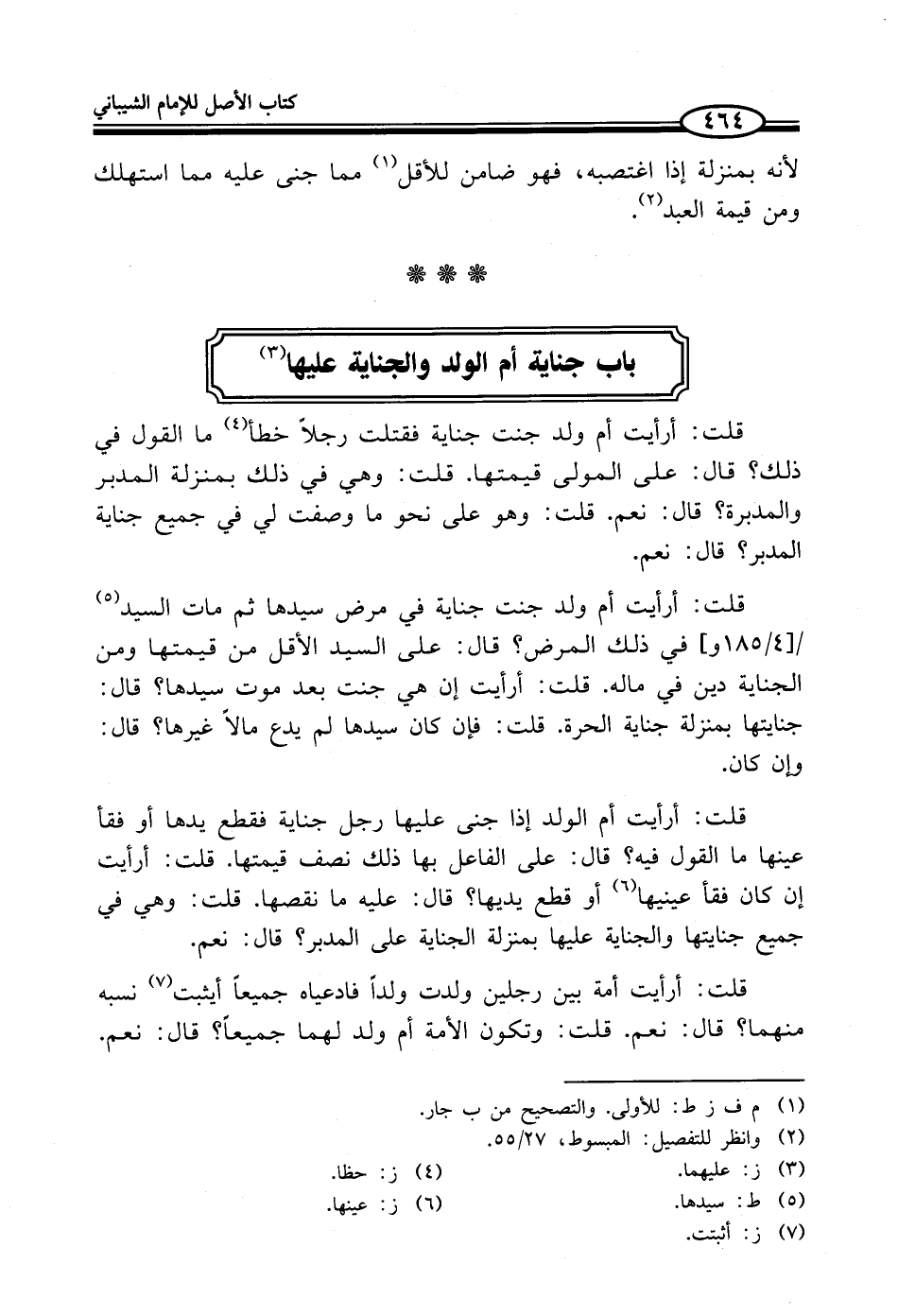 قلت: أرأيت أم ولد جنت جناية فقتلت رجلاً خطأ (¬4) ما القول في ذلك؟ قال: على المولى قيمتها. قلت: وهي في ذلك بمنزلة المدبر والمدبرة؟ قال: نعم. قلت: وهو على نحو ما وصفت لي في جميع جناية المدبر؟ قال: نعم.