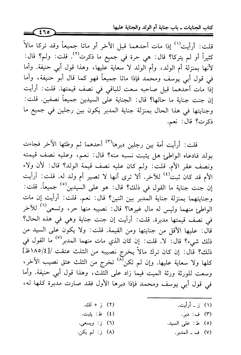 قلت: أرأيت (¬1) إذا مات أحدهما قبل الآخر أو ماتا جميعاً وقد تركا مالاً كثيراً أو لم يتركا؟ قال: هي حرة في جميع ما ذكرت (¬2). قلت: ولم؟ قال: لأنها بمنزلة أم الولد، وأم الولد لا سعاية عليها، وهذا قول أبي حنيفة. وأما في قول أبي يوسف ومحمد فإذا ماتا جميعاً فهو كما قال أبو حنيفة، وأما إذا مات أحدهما قبل صاحبه سعت للباقي في نصف قيمتها. قلت: أرأيت إن جنت جناية ما حالها؟ قال: الجناية على السيدين جميعاً نصفين. قلت: وجنايتها في هذا الحال بمنزلة جناية المدبر يكون بين رجلين في جميع ما ذكرت؟ قال: نعم.