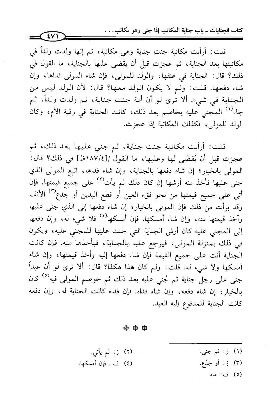 قلت: أرأيت مكاتبة جنت جناية، ثم جني عليها بعد ذلك، ثم عجزت قبل أن يُقضَى لها وعليها، ما القول في ذلك؟ قال: المولى بالخيار؛ إن شاء دفعها بالجناية، وإن شاء فداها، اتبع المولى الذي جنى عليها فأخذ منه أرشها إن كان ذلك لم يأت (¬2) على جميع قيمتها. فإن أتى على جميع قيمتها من نحو فقء العين أو قطع اليدين أو جدع (¬3) الأنف وقد برأت من ذلك فإن المولى بالخيار؛ إن شاء دفعها إلى الذي جنى عليها وأخذ قيمتها منه، وإن شاء أمسكها. فإن أمسكها (¬4) فلا شيء له، وإن دفعها إلى المجني عليه كان أرش الجناية التي جنت عليها للمجني عليه، ويكون في ذلك بمنزلة المولى، فيرجع عليه بالجناية، فيأخذها منه. فإن كانت الجناية أتت على جميع القيمة فإن شاء دفعها إليه وأخذ قيمتها، وإن شاء أمسكها ولا شيء له. قلت: ولم كان هذا هكذا؟ قال: ألا ترى لو أن عبداً جنى على رجل جناية ثم جُني عليه بعد ذلك ثم خوصم المولى فيه (¬5) كان بالخيار؛ إن شاء دفعه، وإن شاء فداه. فإن فداه كانت الجناية له، وإن دفعه كانت الجناية للمدفوع إليه العبد.