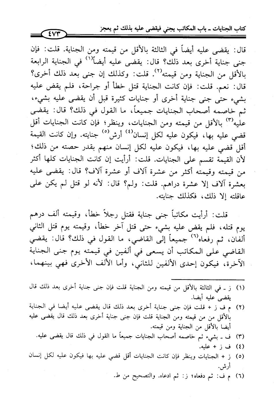 (¬3) ف - بشيء ثم خاصمه أصحاب الجنايات جميعاً ما القول في ذلك قال يقضى عليه.