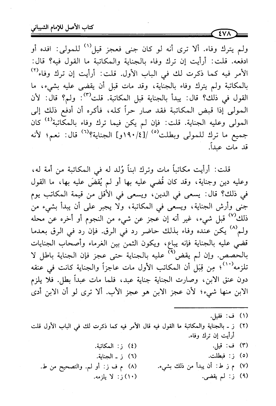(¬2) ز - بالجناية والمكاتبة ما القول فيه قال الاْمر فيه كما ذكرت لك في الباب الأول قلت أرأيت إن ترك وفاء.