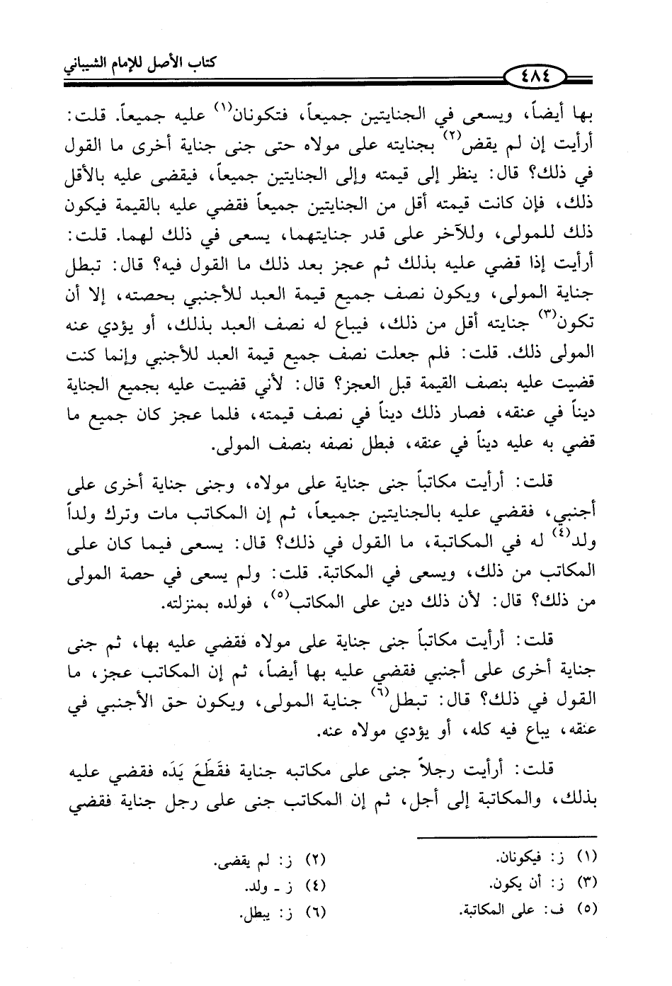 بها أيضاً، ويسعى في الجنايتين جميعاً، فتكونان (¬1) عليه جميعاً. قلت: أرأيت إن لم يقض (¬2) بجنايته على مولاه حتى جنى جناية أخرى ما القول في ذلك؟ قال: ينظر إلى قيمته وإلى الجنايتين جميعاً، فيقضى عليه بالأقل ذلك، فإن كانت قيمته أقل من الجنايتين جميعاً فقضي عليه بالقيمة فيكون ذلك للمولى، وللآخر على قدر جنايتهما، يسعى في ذلك لهما. قلت: أرأيت إذا قضي عليه بذلك ثم عجز بعد ذلك ما القول فيه؟ قال: تبطل جناية المولى، ويكون نصف جميع قيمة العبد للأجنبي بحصته، إلا أن تكون (¬3) جنايته أقل من ذلك، فيباع له نصف العبد بذلك، أو يؤدي عنه المولى ذلك. قلت: فلم جعلت نصف جميع قيمة العبد للأجنبي وإنما كنت قضيت عليه بنصف القيمة قبل العجز؟ قال: لأني قضيت عليه بجميع الجناية ديناً في عنقه، فصار ذلك ديناً في نصف قيمته، فلما عجز كان جميع ما قضي به عليه ديناً في عنقه، فبطل نصفه بنصف المولى.