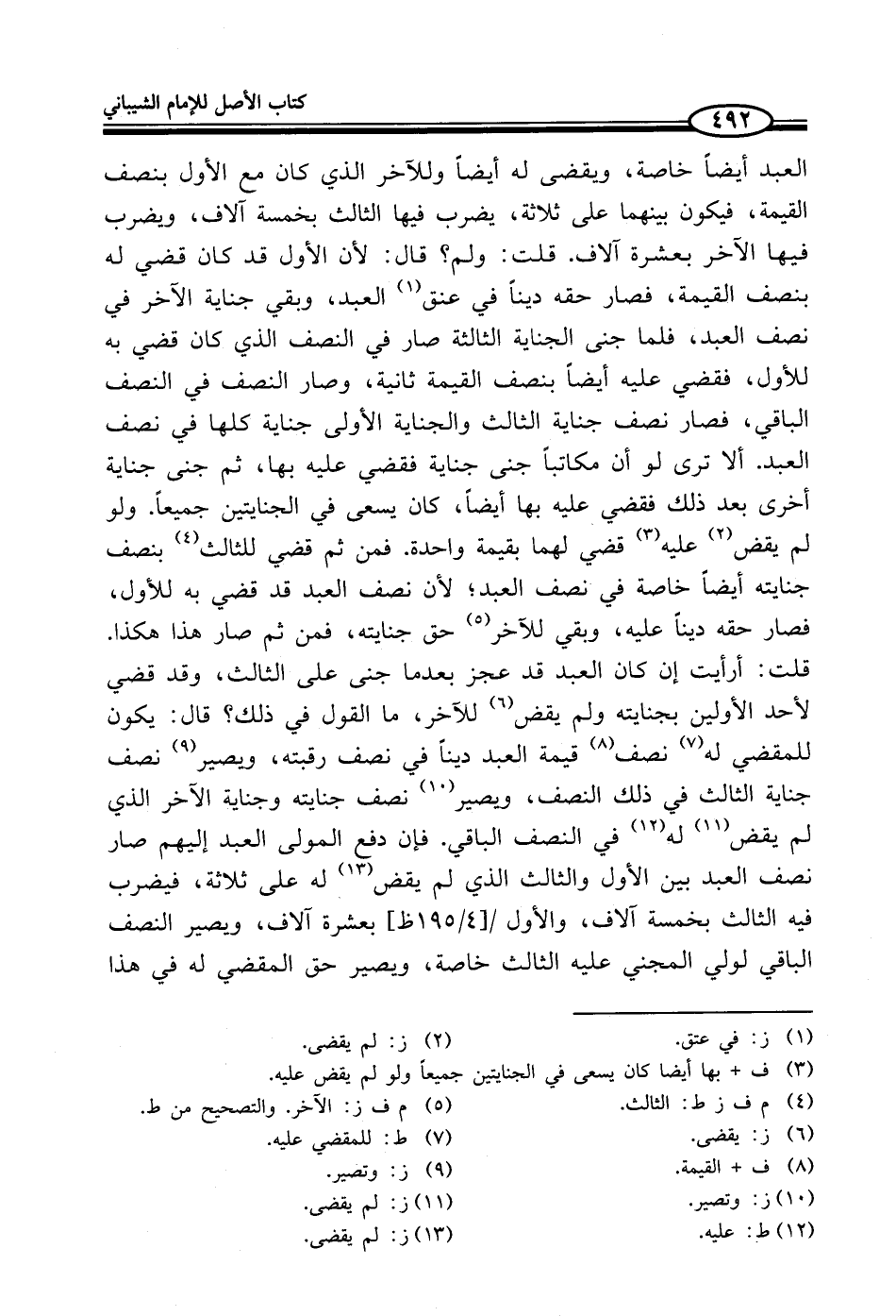 العبد أيضاً خاصة، ويقضى له أيضاً وللآخر الذي كان مع الأول بنصف القيمة، فيكون بينهما على ثلاثة، يضرب فيها الثالث بخمسة آلاف، ويضرب فيها الآخر بعشرة آلاف. قلت: ولم؟ قال: لأن الأول قد كان قضي له بنصف القيمة، فصار حقه ديناً في عنق (¬1) العبد، وبقي جناية الآخر في نصف العبد، فلما جنى الجناية الثالثة صار في النصف الذي كان قضي به للأول، فقضي عليه أيضاً بنصف القيمة ثانية، وصار النصف في النصف الباقي، فصار نصف جناية الثالث والجناية الأولى جناية كلها في نصف العبد. ألا ترى لو أن مكاتباً جنى جناية فقضي عليه بها، ثم جنى جناية أخرى بعد ذلك فقضي عليه بها أيضاً، كان يسعى في الجنايتين جميعاً. ولو لم يقض (¬2) عليه (¬3) قضي لهما بقيمة واحدة. فمن ثم قضي للثالث (¬4) بنصف جنايته أيضاً خاصة في نصف العبد؛ لأن نصف العبد قد قضي به للأول، فصار حقه ديناً عليه، وبقي للآخر (¬5) حق جنايته، فمن ثم صار هذا هكذا. قلت: أرأيت إن كان العبد قد عجز بعدما جنى على الثالث، وقد قضي لأحد الأولين بجنايته ولم يقض (¬6) للآخر، ما القول في ذلك؟ قال: يكون للمقضي له (¬7) نصف (¬8) قيمة العبد ديناً في نصف رقبته، ويصير (¬9) نصف جناية الثالث في ذلك النصف، ويصير (¬10) نصف جنايته وجناية الآخر الذي لم يقض (¬11) له (¬12) في النصف الباقي. فإن دفع المولى العبد إليهم صار نصف العبد بين الأول والثالث الذي لم يقض (¬13) له على ثلاثة، فيضرب فيه الثالث بخمسة آلاف، والأول بعشرة آلاف، ويصير النصف الباقي لولي المجني عليه الثالث خاصة، ويصير حق المقضي له في هذا