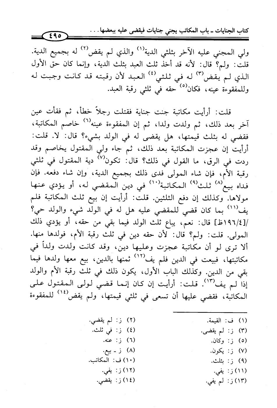 قلت: أرأيت مكاتبة جنت جناية فقتلت رجلاً خطأ، ثم فقأت عين آخر بعد ذلك، ثم ولدت ولدا، ثم إن المفقوءة عينه (¬6) خاصم المكاتبة، فقضي له بثلث قيمتها، هل يقضى له في الولد بشيء؟ قال: لا. قلت: أرأيت إن عجزت المكاتبة بعد ذلك، ثم جاء ولي المقتول يخاصم وقد ردت في الرق، ما القول في ذلك؟ قال: تكون (¬7) دية المقتول في ثلثي رقبة الأم، فإن شاء المولى فدى ذلك بجميع الدية، وإن شاء دفعه. فإن فداه بيع (¬8) ثلث (¬9) المكاتبة (¬10) في دين المقضي له، أو يؤدي عنها مولاها. وكذلك إن دفع الثلثين. قلت: أرأيت إن بيع ثلث المكاتبة فلم يف (¬11) بما كان قضي للمقضي عليه هل له في الولد شيء والولد حي؟ قال: نعم، يباع ثلث الولد فيما بقي من حقه، أو يؤدي ذلك المولى. قلت: ولم؟ قال: لأن حقه دين في ثلث رقبة الأم، فولدها منها. ألا ترى لو أن مكاتبة عجزت وعليها دين، وقد كانت ولدت ولداً في مكاتبتها، فبيعت في الدين فلم يف (¬12) ثمنها بالدين، بيع معها ولدها فيما بقي من الدين. وكذلك الباب الأول، يكون ذلك في ثلث رقبة الأم والولد إذا لم يف (¬13). قلت: أرأيت إن كان إنما قضي لولى المقتول على المكاتبة، فقضي عليها أن تسعى في ثلثي قيمتها، ولم يقض (¬14) للمفقوءة
