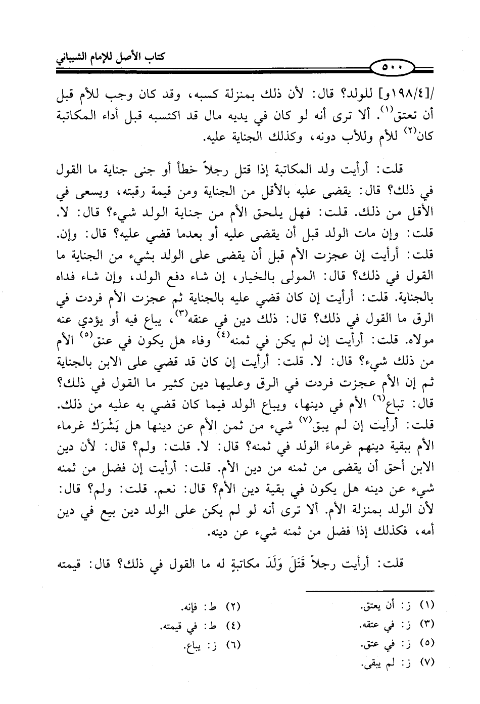 قلت: أرأيت ولد المكاتبة إذا قتل رجلاً خطأ أو جنى جناية ما القول في ذلك؟ قال: يقضى عليه بالأقل من الجناية ومن قيمة رقبته، وشمعى في الأقل من ذلك. قلت: فهل يلحق الأم من جناية الولد شيء؟ قال: لا. قلت: وإن مات الولد قبل أن يقضى عليه أو بعدما قضي عليه؟ قال: وإن. قلت: أرأيت إن عجزت الأم قبل أن يقضى على الولد بشيء من الجناية ما القول في ذلك؟ قال: المولى بالخيار، إن شاء دفع الولد، وإن شاء فداه بالجناية. قلت: أرأيت إن كان قضي عليه بالجناية ثم عجزت الأم فردت في الرق ما القول في ذلك؟ قال: ذلك دين في عنقه (¬3)، يباع فيه أو يؤدي عنه مولاه. قلت: أرأيت إن لم يكن في ثمنه (¬4) وفاء هل يكون في عنق (¬5) الأم من ذلك شيء؟ قال: لا. قلت: أرأيت إن كان قد قضي على الابن بالجناية ثم إن الأم عجزت فردت في الرق وعليها دين كثير ما القول في ذلك؟ قال: تباع (¬6) الأم في دينها، ويباع الولد فيما كان قضي به عليه من ذلك. قلت: أرأيت إن لم يبق (¬7) شيء من ثمن الأم عن دينها هل يَشْرَك غرماء الأم ببقية دينهم غرماءَ الولد في ثمنه؟ قال: لا. قلت: ولم؟ قال: لأن دين الابن أحق أن يقضى من ثمنه من دين الأم. قلت: أرأيت إن فضل من ثمنه شيء عن دينه هل يكون في بقية دين الأم؟ قال: نعم. قلت: ولم؟ قال: لأن الولد بمنزلة الأم. ألا ترى أنه لو لم يكن على الولد دين بيع في دين أمه، فكذلك إذا فضل من ثمنه شيء عن دينه.