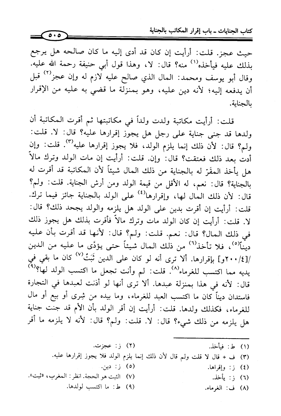 قلت: أرأيت مكاتبة ولدت ولداً في مكاتبتها ثم أقرت المكاتبة أن ولدها قد جنى جناية على رجل هل يجوز إقرارها عليه؟ قال: لا. قلت: ولم؟ قال: لأن ذلك إنما يلزم الولد، فلا يجوز إقرارها عليه (¬3). قلت: وإن أدت بعد ذلك فعتقت؟ قال: وإن. قلت: أرأيت إن مات الولد وترك مالاً هل يأخذ المقَرّ له بالجناية من ذلك المال شيئاً لأن المكاتبة قد أقرت له بالجناية؟ قال: نعم، له الأقل من قيمة الولد ومن أرش الجناية. قلت: ولم؟ قال: لأن ذلك المال لها، وإقرارها (¬4) على الولد بالجناية جائز فيما ترك. قلت: أرأيت إن أقرت بدين على الولد هل يلزمه والولد يجحد ذلك؟ قال: لا. قلت: أرأيت إن كان الولد مات وترك مالاً فأقرت بذلك هل يجوز ذلك في ذلك المال؟ قال: نعم. قلت: ولم؟ قال: لأنها قد أقرت بأن عليه ديناً (¬5)، فلا تأخذ (¬6) من ذلك المال شيئاً حتى يؤدَّى ما عليه من الدين بإقرارها. ألا ترى أنه لو كان على الدين ثَبَتٌ (¬7) كان ما بقي في يديه مما اكتسب للغرماء (¬8). قلت: لم وأنت تجعل ما اكتسب الولد لها؟ (¬9) قال: لأنه في هذا بمنزلة عبدها. ألا ترى أنها لو أذنت لعبدها في التجارة فاستدان ديناً كان ما اكتسب العبد للغرماء، وما بيده من شِرى أو بيع أو مال للغرماء، فكذلك ولدها. قلت: أرأيت إن أقر الولد بأن الأم قد جنت جناية هل يلزمه من ذلك شيء؟ قال: لا. قلت: ولم؟ قال: لأنه لا يلزمه ما أقر